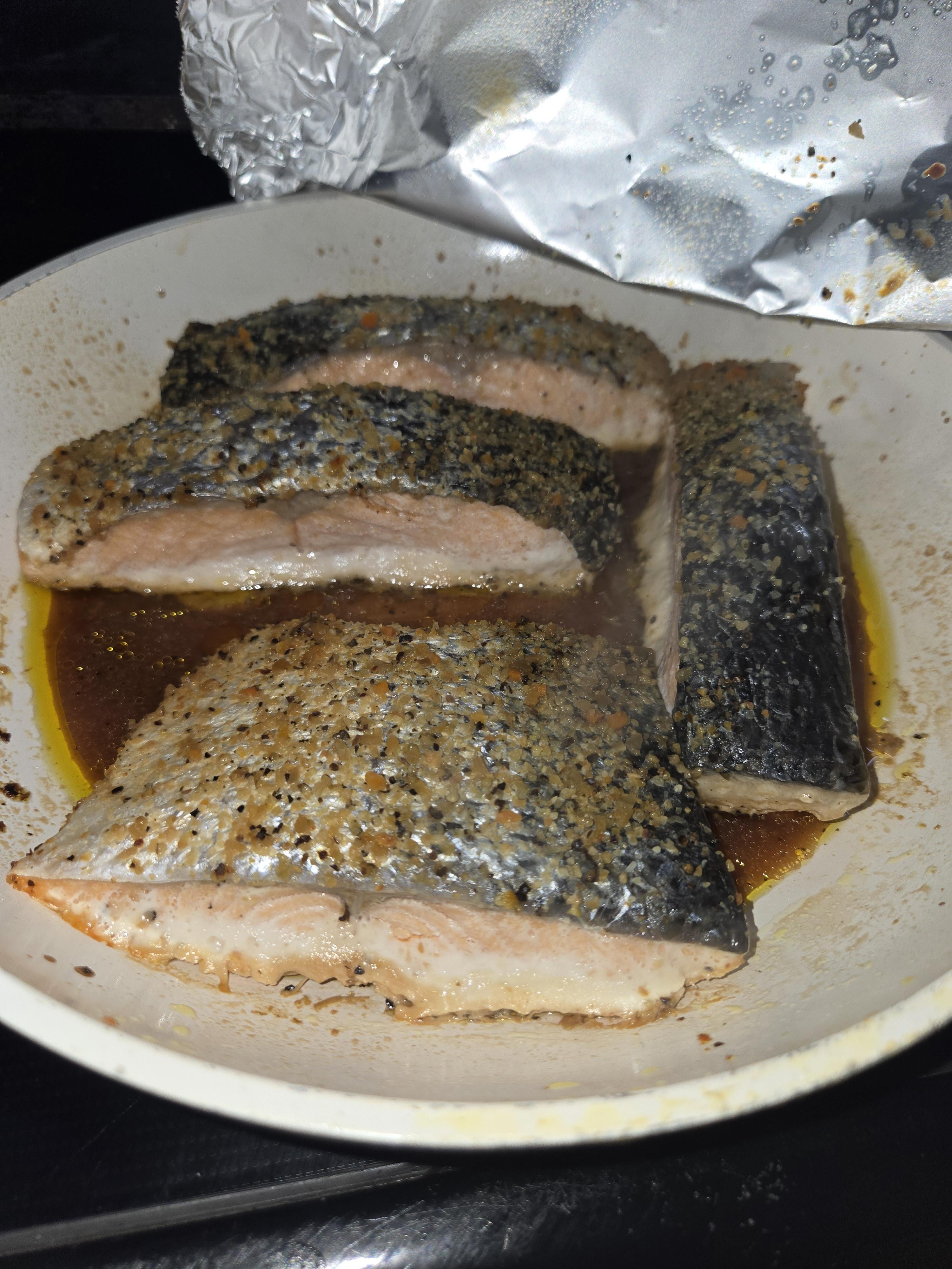 I used the pan to place the salmon in the oven with aluminum foil covered in top of it. I added a thin layer of butter on the pan then added garlic seasoning, black pepper and maggi Asian seasonin sauce.