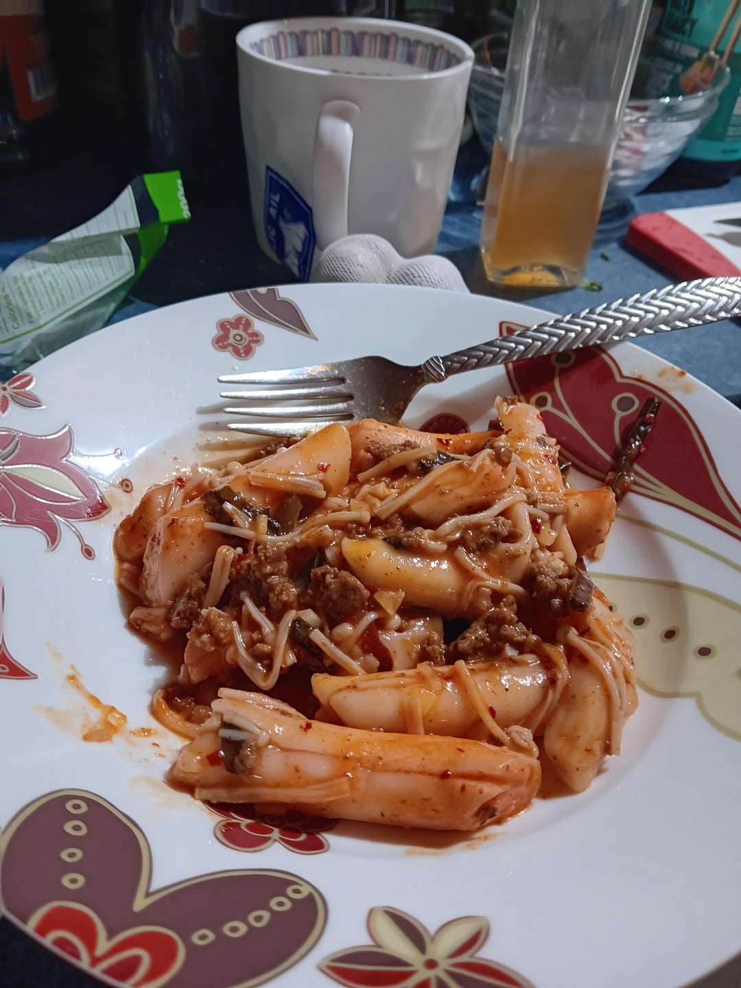 I made Tteok-bokki and Braised tofu both with enoki mushrooms. Made the Tteok-bokki with kimchi in the sauce and man oh man was it ever a delish meal. I finally made my own kimchi so I could make these dishes 😋 ☺️