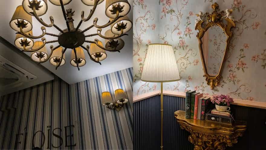 Eloise’s royal blue door and irresistible desserts greet you. The pastel colors, vintage brass accents, and delicate lighting create a timeless and modern space. The cafe’s corners are meticulously designed to reflect the owner’s love of European culture, making it a visual delight.
