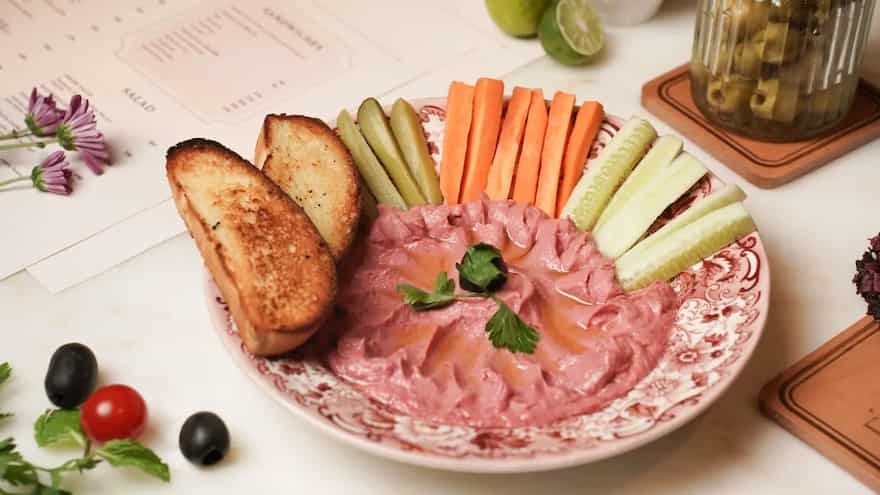 The Beetroot Hummus will get a 10 on 10 for its appearance, and then the taste. This visually striking dish doesn’t just impress with its colour but also with its flavour. The hummus is creamy and sweet because it has pureed beetroot in it. This goes well with the tangy garlic bread and fresh, crunchy vegetables it comes with. The garlic bread is crunchy, which makes it perfect for scooping up the hummus.