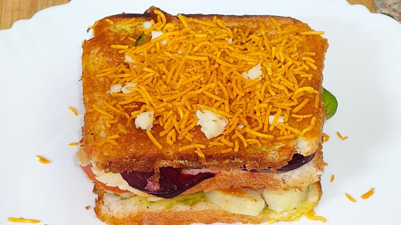 हेलो एवरीवन, वेलकम बैक टू माय चैनल। तो आज हम बनाएंगे बहुत ही ज्यादा यम्मी, स्पाइसी और बहुत ही फ्लेवरफुल बॉम्बे सैंडविच। गाइस, यह बहुत ही टेस्टी बनता है। अगर आपने एक बार बनाया ना, तो बार-बार बनाएंगे और प्लस यह बहुत यम्मी लगता है गाइस। यहां पर मैंने कुछ वेजिटेबल्स ले लिए हैं। उनको कर लिया है चॉप। इनको स्लाइस कर लेंगे। इस तरीके से। यहां पे अनियन स्लाइस कर लिया है। टोमेटो स्लाइस करे हैं। बीटर रूट स्लाइस करा है। कैप्सिकम स्लाइस करा है। आलू बॉईल करके स्लाइस करा है। गाइस इससे बहुत ही अच्छा फ्लेवर आएगा इन सारी वेजिटेबल्स से। तो यहां पे ब्रेड का स्लाइस ले लिया है। उस पे लगाएंगे बटर। बटर लगाने के बाद ना हम इस पे ना ग्रीन चटनी लगाएंगे। बेसिक वाली जो ग्रीन चटनी होती है ना धनिया वाली वो। यहां पे बेसिक ग्रीन चटनी लगाएंगे। इससे गाइस बहुत ही अच्छा फ्लेवर आने वाला है। इसको स्किप मत करिएगा और एकदम ज्यादा सा ग्रीन चटनी लगाइएगा। उससे बहुत ही टेस्टी फ्लेवर आएगा। तो इस तरीके से इसको कर लेंगे स्प्रेड और यहां पे। तो इसी तरीके से इसको स्प्रेड कर लेंगे और यहां पे जो हमने उबले हुए आलू लिए हैं उनको इस तरीके से काटा है वो लगा देंगे। इसी तरीके से सारे आलू लगा देंगे हम। और इस पर हम चिल्ली फ्लेक्स डालेंगे गाइस। इस चिल्ली फ्लेक्स से बहुत ही अच्छा फ्लेवर आएगा। स्किप मत करिएगा आप। तो यहां पर देखिए हमने चिल्ली फ्लेक्स डाल दिए। उसके बाद हम डालेंगे थोड़ा सा नमक स्वाद अनुसार। थोड़ा-थोड़ा नमक डालते रहेंगे वरना फीका हो जाएगा सैंडविच। यहां पर डाला है थोड़ा सा चाट मसाला। और ऐसे यहां पे टमाटर के काटे हुए हैं स्लाइस। वो ऐड करेंगे। इसी तरीके से टमाटर लगाएंगे हम। और यहां पर ना हम एक जो ब्रेड स्लाइस लिया है दूसरा मैंने उस पे लगाया है टोमेटो केचप टोमेटो सॉस लगाया है और इस तरीके से इसको फैला लेंगे और इसको इस तरीके से रख देंगे आप देख रहे हैं इस तरीके से रखने के बाद फिर से ब्रेड पे हम बटर लगाएंगे ऊपर वाली पीस पे और इस पे मैंने यहां पे लगाई है शेजवान सॉस एक चम्मच भर के हम शेजवान सॉस लगाएंगे इसको भी अच्छे से फैला देंगे गाइस उसके बाद हमने जो प्याज काटी थी अब हम वह लगाएंगे। प्याज जो काटी थी वह लगाने के बाद हम इसमें लगाएंगे बीट रूट। चुकंदर लगाएंगे गाइस हम। यस चुकंदर से बहुत ही अच्छा फ्लेवर आएगा इसमें। तो यह लगाएंगे। उसके बाद हम इसमें लगाएंगे शिमला मिर्च। हमने शिमला मिर्च भी कट करके रख ली है। वो लगाएंगे। गाइस, यह बहुत ही टेस्टी बनता है सैंडविच। एक बार ट्राई जरूर कीजिएगा। तो, यहां पर डाला है मैंने नमक। यहां पर डाला है चाट मसाला। इससे बहुत ही अच्छा फ्लेवर आएगा। और यहां पर लगाएंगे बटर फिर से हम ब्रेड पे। और इस तरीके से अप्लाई कर लेंगे लास्ट वाली स