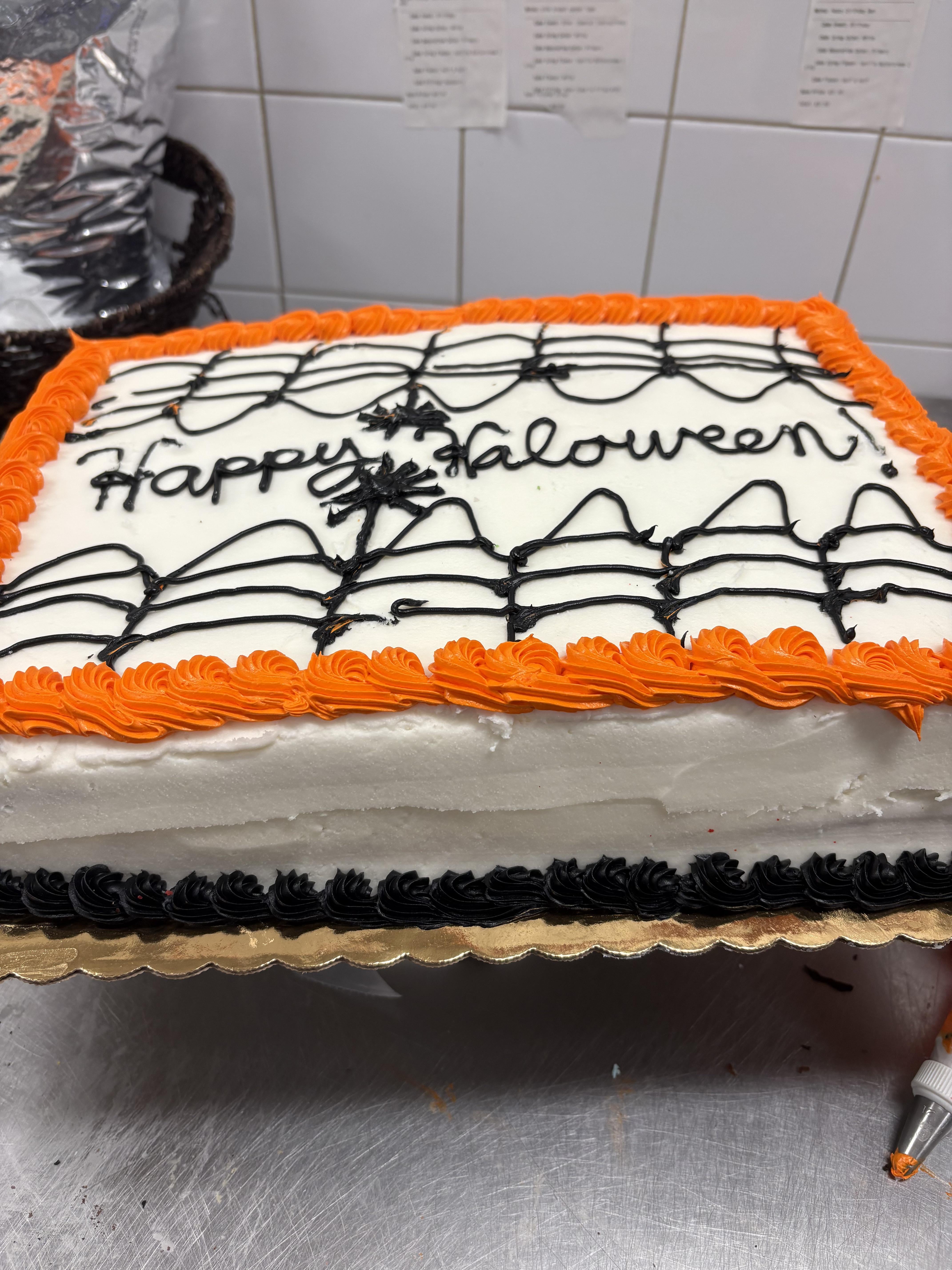In the nicest way possible, I would not be pleased with this outcome if I were a paying customer. Spelling error on “Halloween” (it has 2 Ls) (and the piping of the letters is not great – it looks like you maybe touched the piping tip to the cake in multiple spots), the cake looks like it is not level, the spiders looks more like asterisks ***, and the webs really don’t look like webs – sorry friend! Again I mean this all so kindly.
