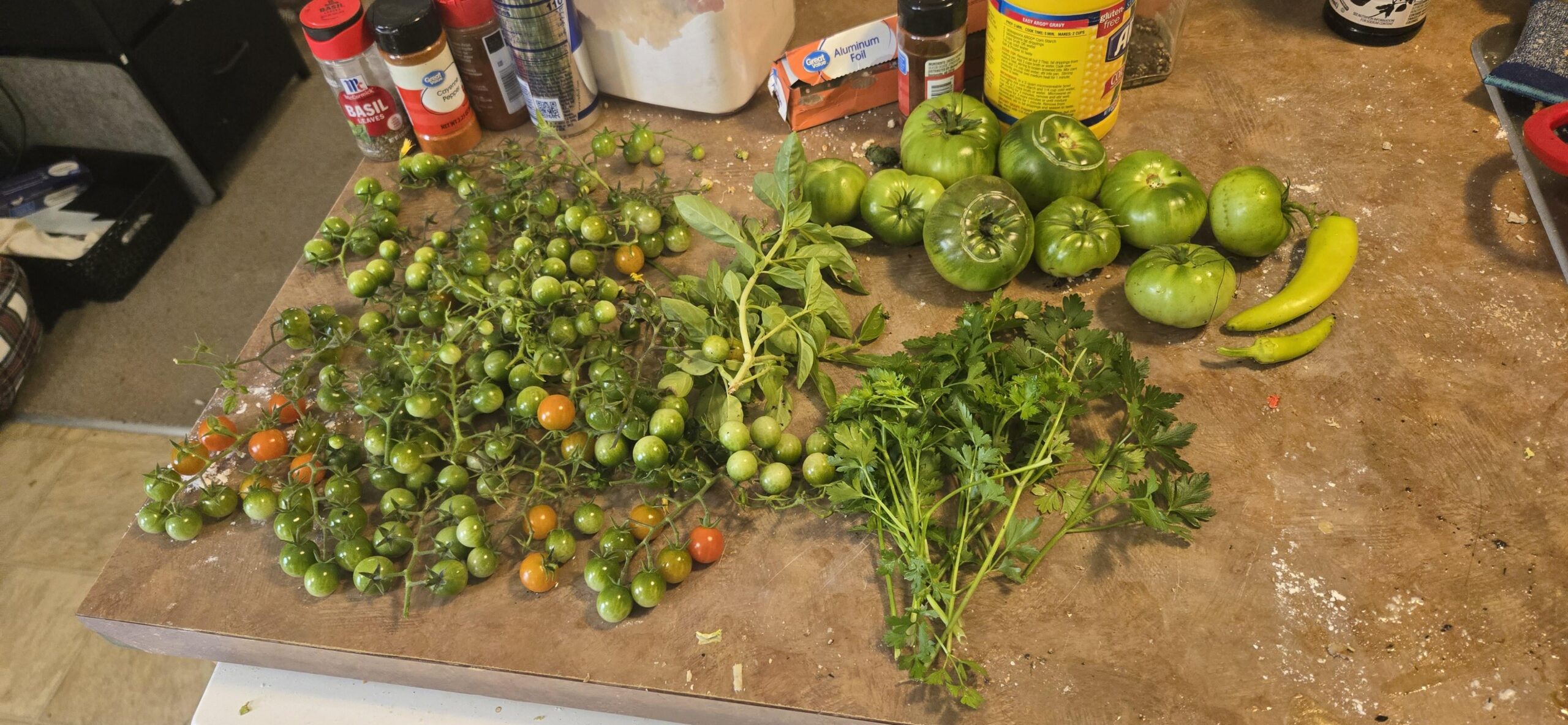 This was my starting harvest and now I’m down to a small plate of greens after ripening them indoors and turning to tomato sauce