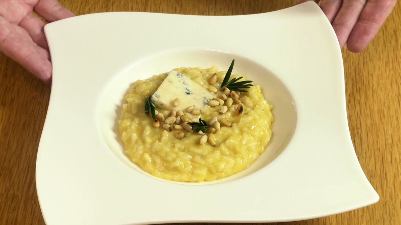 03:43 – Rice, slicing Gorgonzola, and toasting pine nuts
