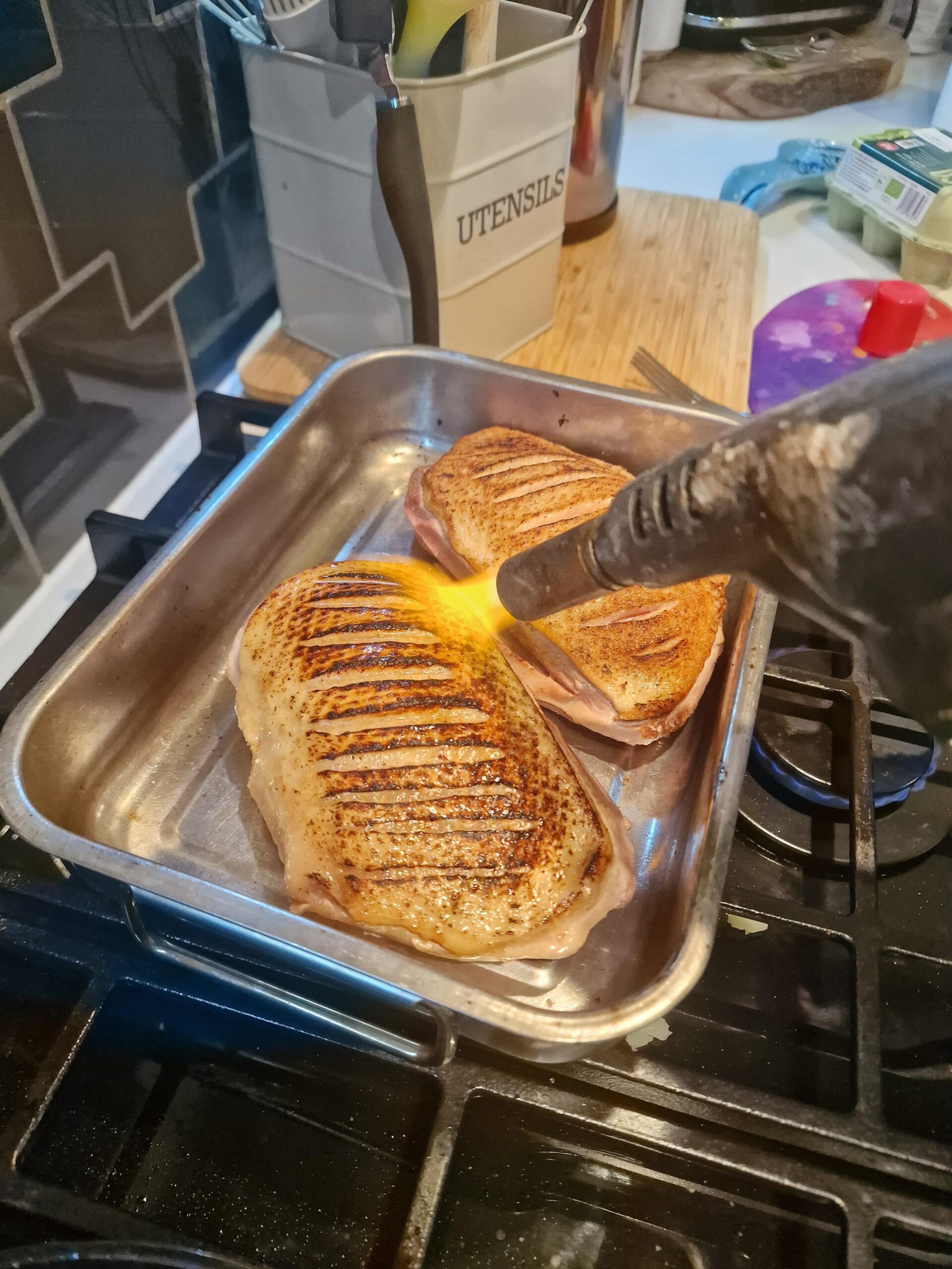 I don’t generally recommend SV for duck or goose breast, the fat doesn’t render enough. I also caution against using the blowtorch for this purpose, as doing so can lead to burnt flavors, rather than caramelized.