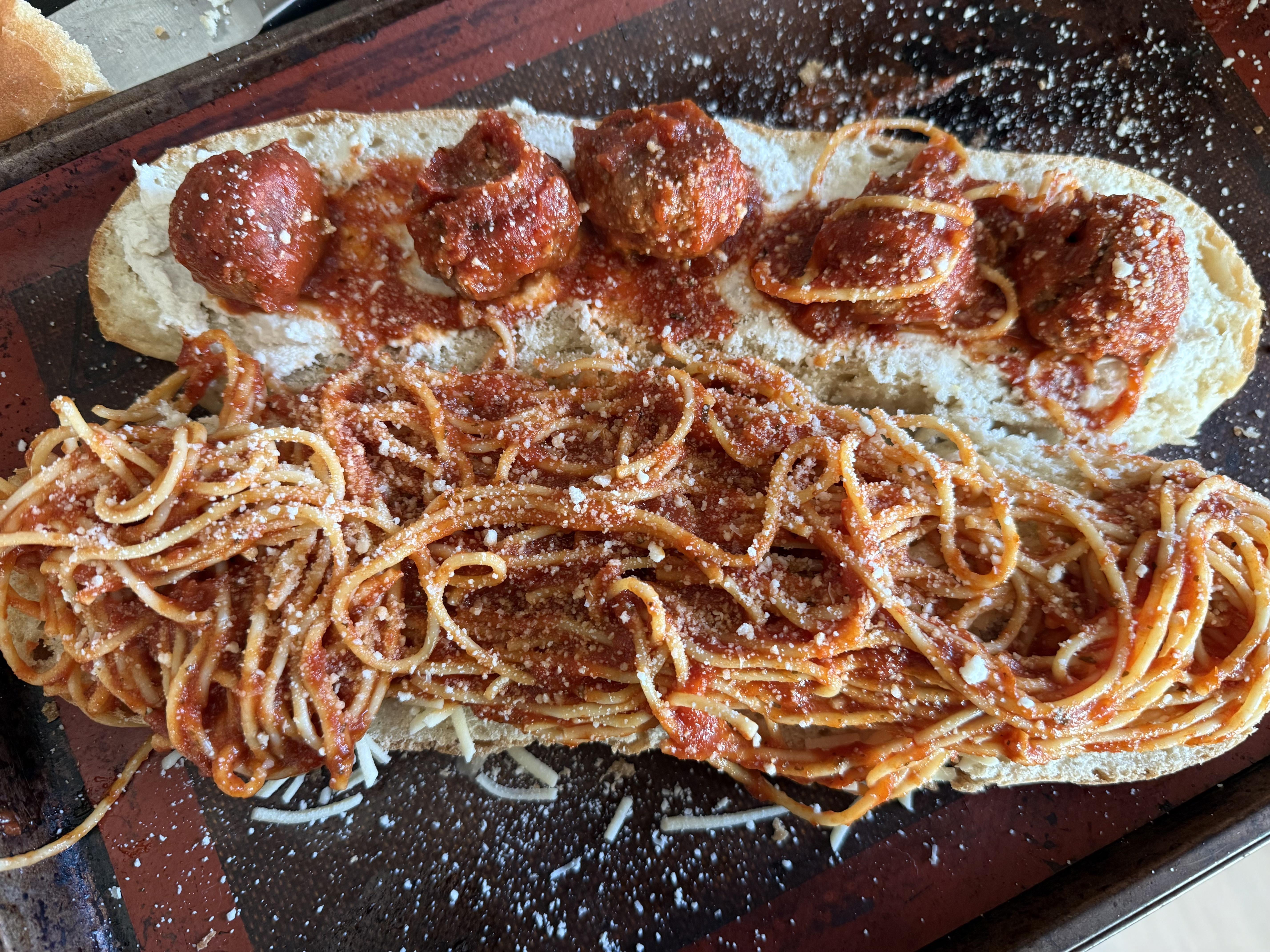 Homemade spaghetti and impossible meatballs with vegan motz and ricotta on fresh Italian bread. Yum O.