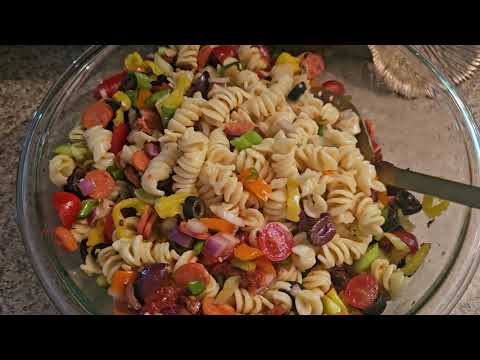 Hello all, whoever, wherever, and whenever you are. Let’s make a Mediterranean pasta salad. My take on Italian pasta salad, and it’s one of my go-to party dishes, especially on warm days. I would share it with the world as I’m often asked to write it down before I leave gatherings. Before you prepare, I encourage you to put on some mood music or good audible because it does take quite a bit of time during preparation. I pre-marinate my red onions in a mixture of 1/3 water, 1/3 champagne vinegar, and 1/3 combination of truffle oil and hot honey. Olive oil and regular honey work well, but truff oil and hot honey just add a pop of flavor that makes it truly special. I lightly drain before I add it in. They will be crunchy and delicious, but not overpowering. If you don’t pre- marinate them, please pre-oak them in water for at least an hour. Otherwise, you will have onion salad. I chop up everything while my pasta is cooking. Once the pasta is al dente, meaning to the tooth, as in firm, not mushy, I quickly drain the pasta and add in Italian dressing while the pasta is still warm. The pasta will soak up the dressing and be just right. You absolutely can make your own dressing, especially if you have a classic house recipe. I choose to use Marzad’s Italian dressing. It is my favorite for this dish. one jar per box of pasta. It has a balance to it that doesn’t seem to bite too much and it melds in with all of the ingredients. I add some green onions, about two bunches. To help with incorporating everything, it is important to mix after each ingredient is added. Otherwise, all the goodies will settle to the bottom of the bowl or sit on top. I use two different bowls while preparing to help with this. and then do a final serving of the incorporated ingredients into the larger of the two bowls. I add both black olives and calamato olives. I really enjoy the purple tones and the contrast of flavors that this pasta brings. You can taste all the different elements even though they are well mixed. I add both mild banana peppers and orange bell peppers. My granny is allergic to food coloring, so I enjoy the brand that enhances the yellow with turmeric. I also add a package of mini pepperoni slices. This is optional, of course, for those who choose to be vegetarian. Then I add cherry tomatoes and drain sundried tomatoes. I save the oil that they are in for another dish, not Oh my goodness, this smells so delicious already. I just love all the beautiful colors. I like to think about the different places and hands that assisted with these ingredients from around the world. I enjoy that they are all brought together in this bowl. I take some time to extend some appreciation and incorporate some positive energy and well wishes into my salad. While I am mixing, I also like to think of the memories made while sharing this dish over the years and the people both here and no longer here who have enjoyed it. Once all the goodies are blended, it is time to fold in the pasta. Because the pasta was hot and ready when adding the dressing, it soaks up all the dressing and is not gushy. You essentially can serve it once it’s chilled. You don’t have to wait until the next day. However, I feel if you are patient, it does get a little magical by chilling overnight. I kept a little bit of the goodie mixture aside in the smaller bowl so that I can incorporate loosely broken, drained, and dried feta. I leave the feta in larger pieces because after further mixing it into the pasta, it may easily crumble into non-existence if you aren’t careful. Most of those that I serve love cheese, so this would not be a good thing. But the larger pieces also help those who want to avoid it and easily scoop around it. I feel the addition of both the calamata olives and the feta make this more of a Mediterranean pasta salad compared to the regular Italian pasta salad. Gently fold in the pasta mixture and keep folding until it is well incorporated and observably balanced. Time for the finishing touches. Shower on some freshly grated Parmesan cheese. Seriously, my friends, all the grading is worth it. It will hold up much better in your salad. Add a sprinkle of green by adding freshly chopped parsley and basil. Lastly, add a few cherry tomatoes. I made mine into flowers by cutting at the end 3/4 of the way inward and repeated until I had about five or so petals. There you have it. I hope this serves you well and you were able to enjoy my take on this pasta salad.
