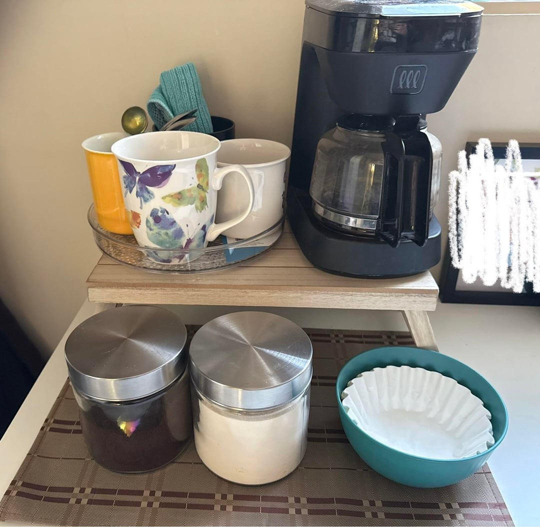 I share a house with 4 other adults, and I have to have coffee before I deal with leaving my room. I am the only one who drinks dark roast. The kitchen sink is often filled to the brim with someone else’s dishes (I have my own dishes/cook my own food) so I have my own little coffee oasis on my workstation. My coffee pot, while absolutely not fancy, is exactly big enough for two cups of coffee. Eventually I go down and help clean up the kitchen, but this little spot is the highlight of my morning. When I do, I bring down my coffee stuff to wash and bring up fresh water for the next pot.