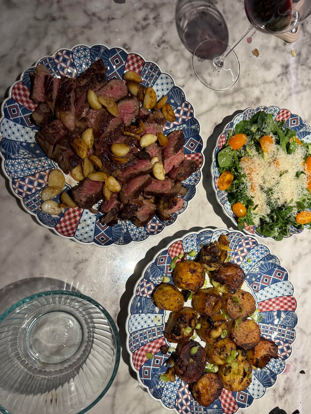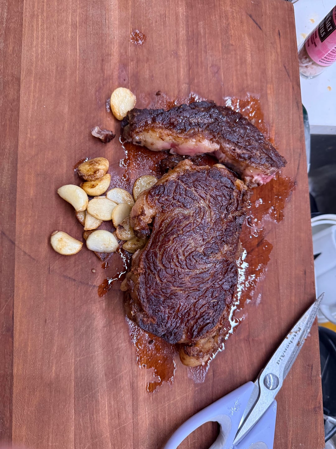 Ugh. Looks great. Tons of garlic cloves is an underrated accoutrement w/ steak. If you can get them jammy and sweet without burning thats the sweet spot.