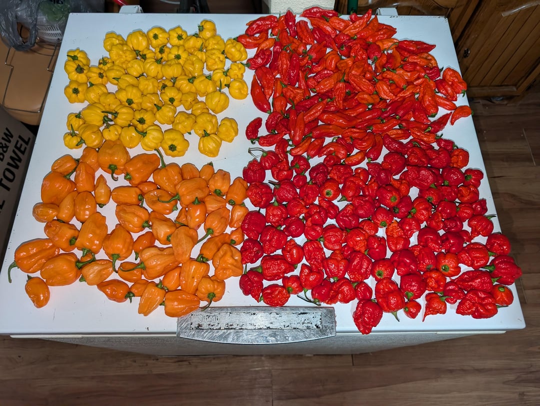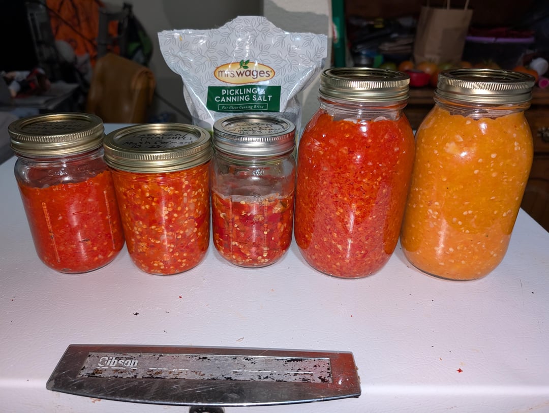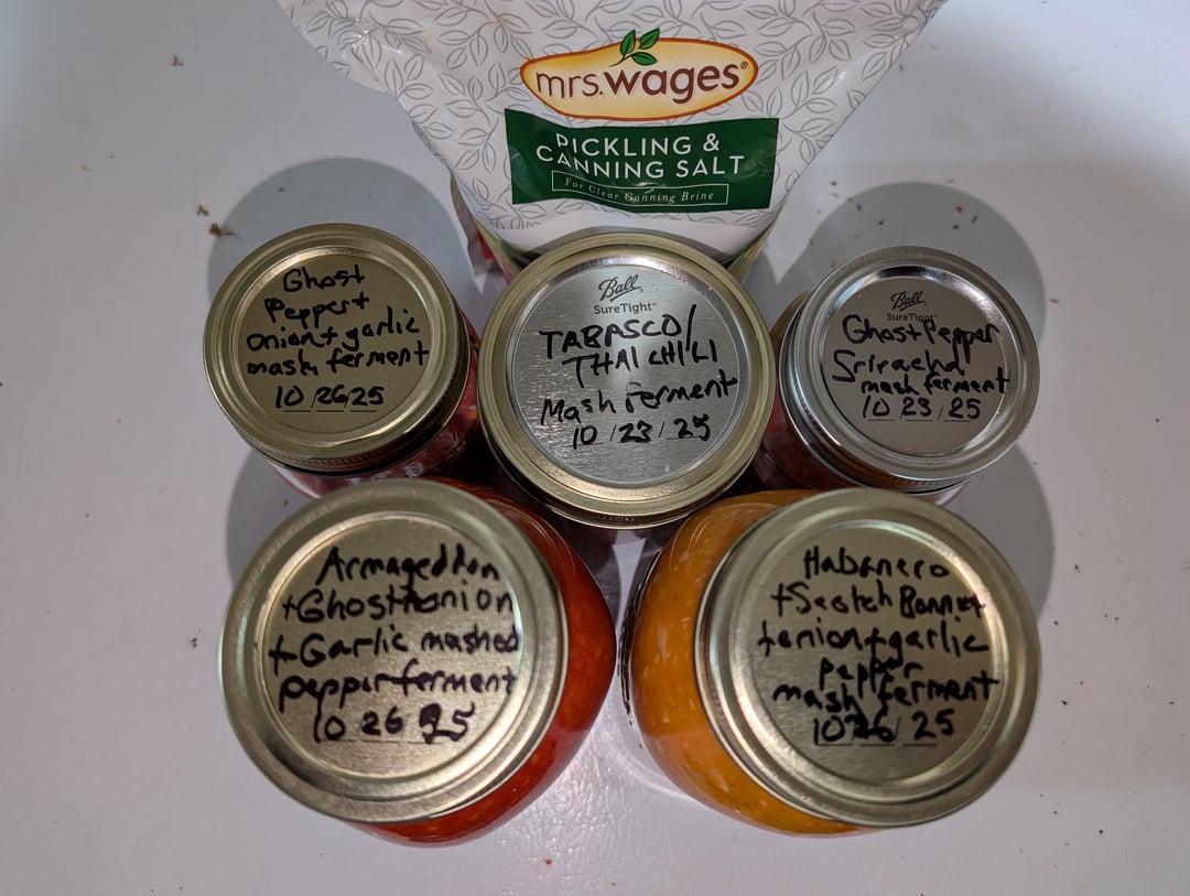 Here in about a month or so it's going to be hot sauce making time! Made multiple jars of mashed pepper ferment tonight. Tonight I did Armageddon, Red Ghost, Scotch, bonnet and Habanero, I also have my other two jars that I made about 3 days ago. One is mainly Sriracha jalapeno peppers with a single ghost pepper in there, and the other is Tabasco and Thai chilies.