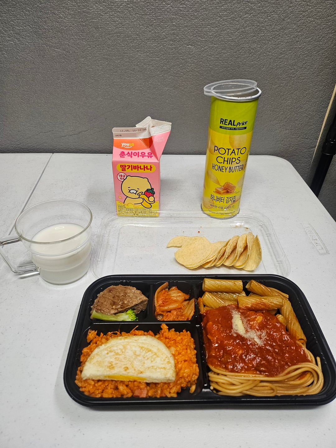 For the price, the combo box was better than expected: sweet-tangy spaghetti sauce, omelet rice with a slight smoky note, and a hamburger steak that wasn’t too dry. The honey-butter chips paired surprisingly well.