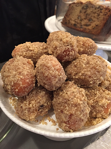Festive trays of assorted Italian cookies wrapped in cellophane, tied with a big bow, decorate the market, ready for you to take to a holiday party.