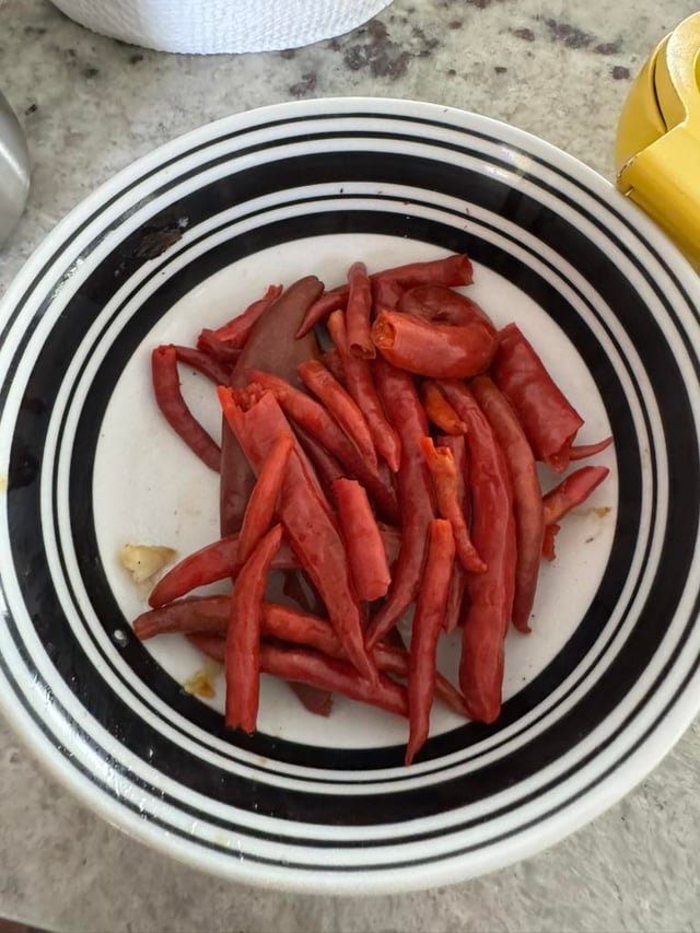 1. Destem chiles and rehydrate in boiling water (most of them didn't have stems tbh. Some seeds came out in the water but otherwise I didn't deseed)