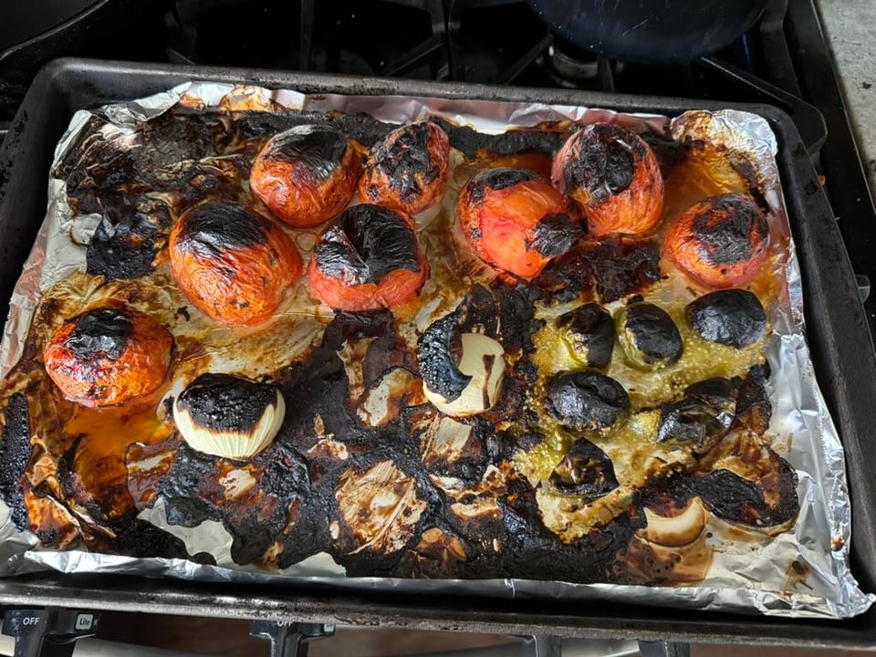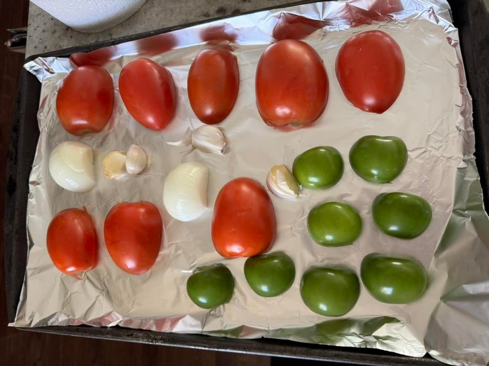 2. Roast tomatoes, tomatillo, onion and garlic under broiler until charred, turning every 5 mins