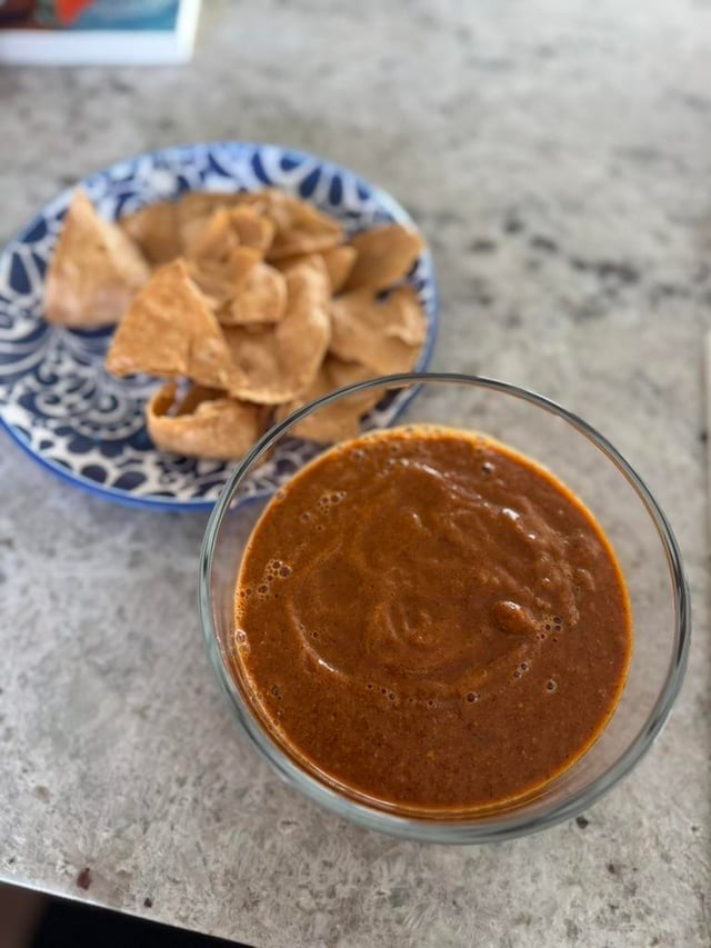 3. Blend all of the above with lime juice, kosher salt, ~1 tsp ACV, ~1 tsp sesame seeds. I added some water from the rehydrated chiles to loosen it up.