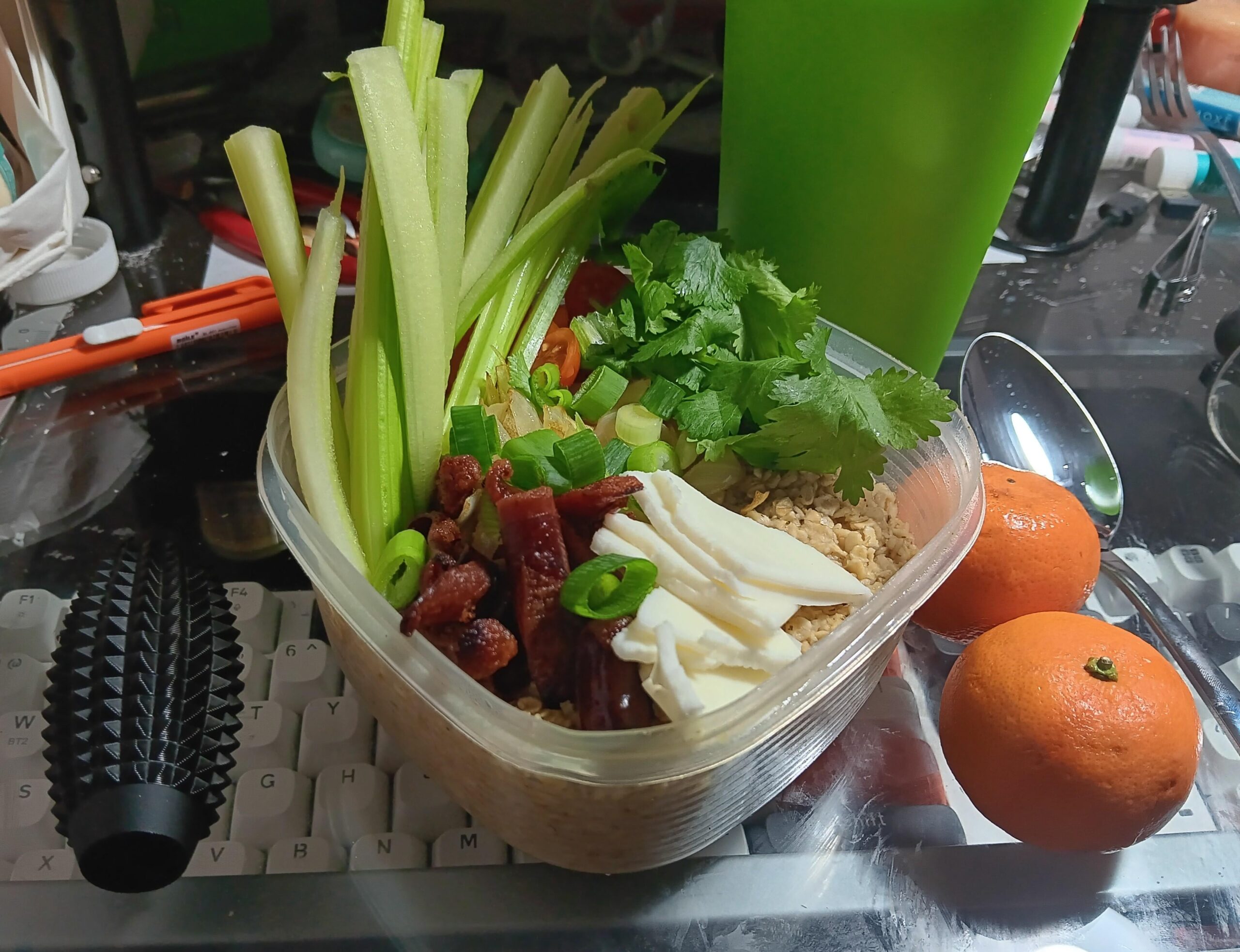 This mornings culinary experience: savory oatmeal breakfast (slim Jim variant) classic instant oatmeal paired with beef bullion beef broth, fried slim Jim's, fried onion & garlic, sliced cherry tomatoes, green onion, cilantro, white American cheese, & celery forest garnish..