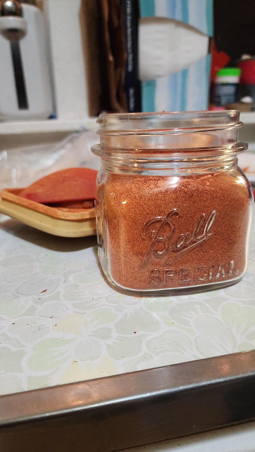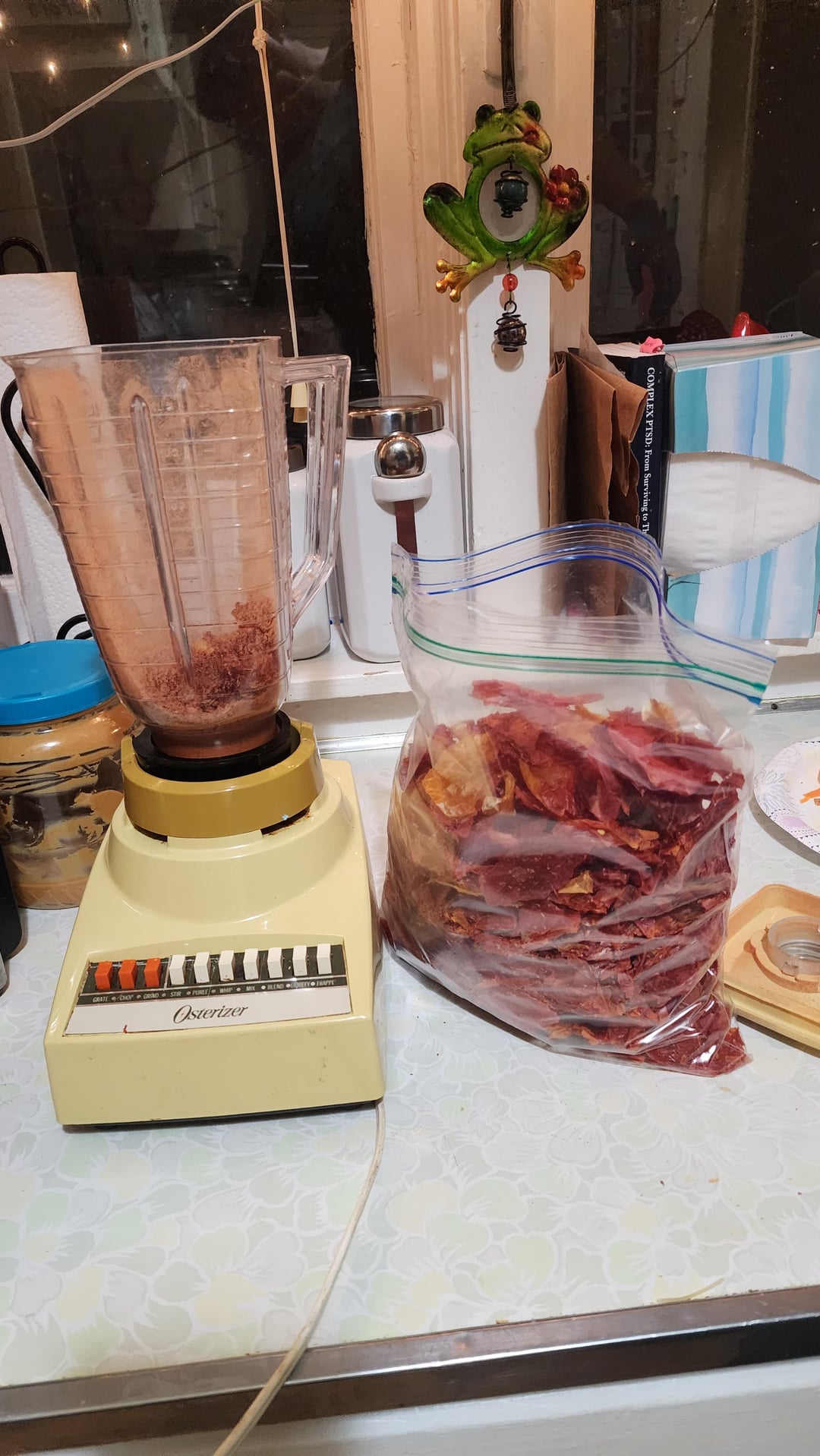 A gallon of dehydrated tomato skins from several batches of processed tomatoes condensed down quite a bit in the blender. Tomato powder is amazing, and I really wish I'd started doing this sooner. I think we'll get to a point where we never need tomato paste again