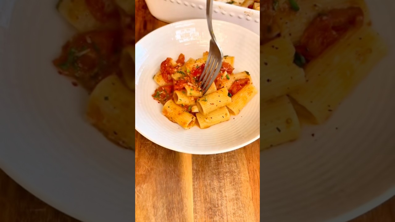 4️⃣ Amestecă pastele cu roșiile și usturoiul copt (poți folosi doar miezul moale).