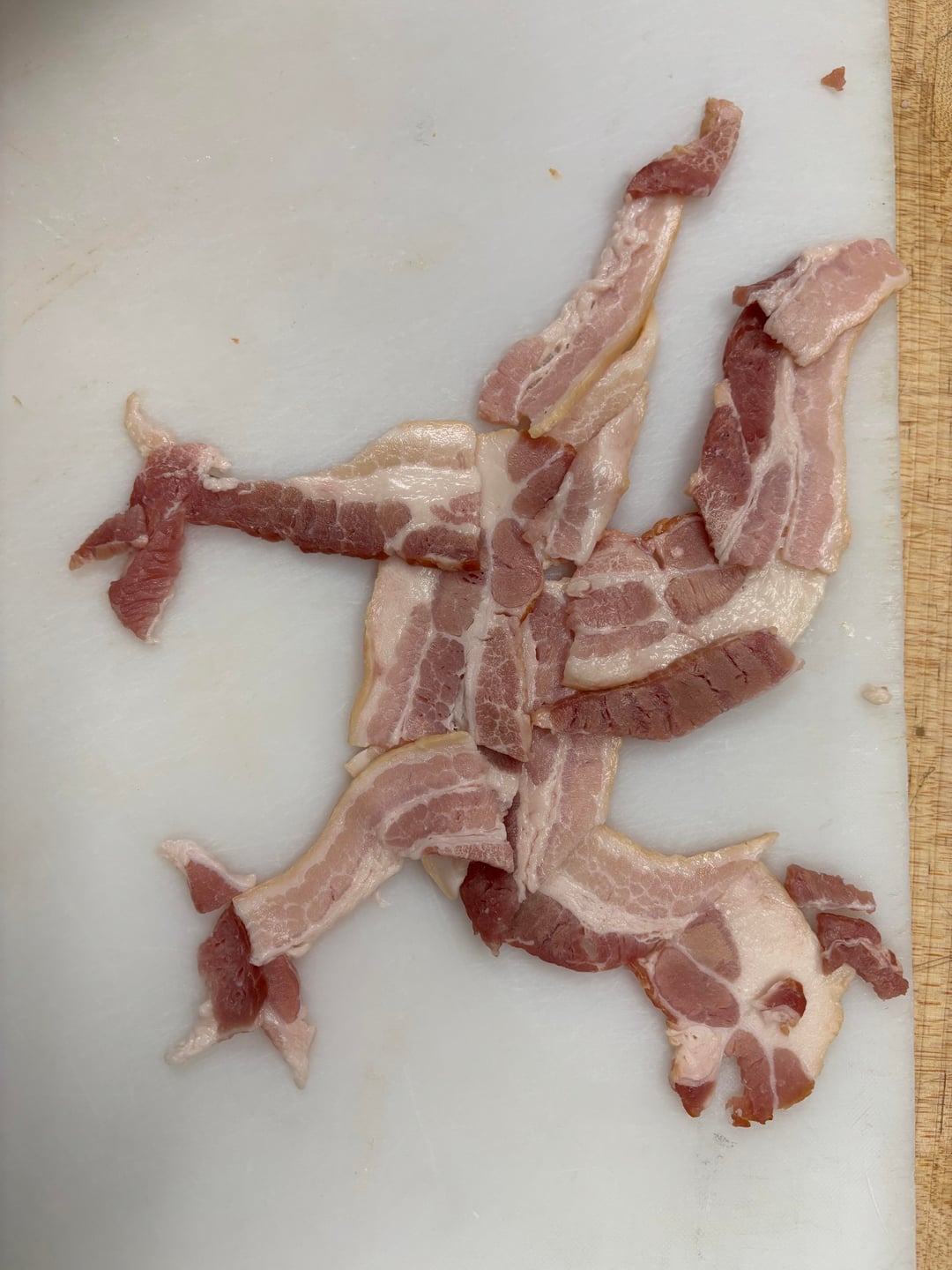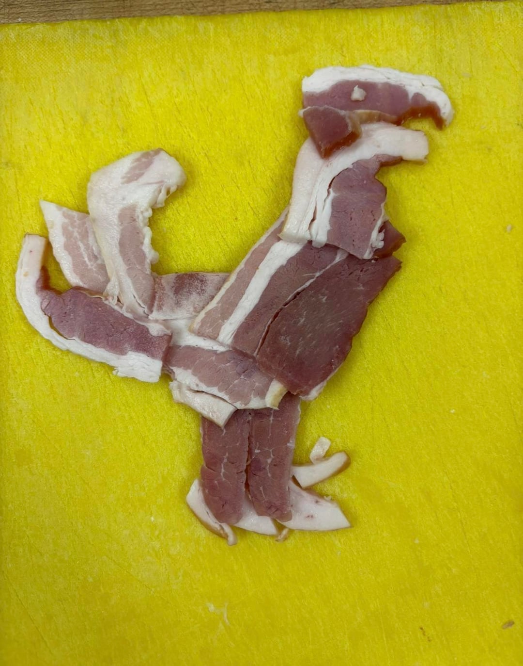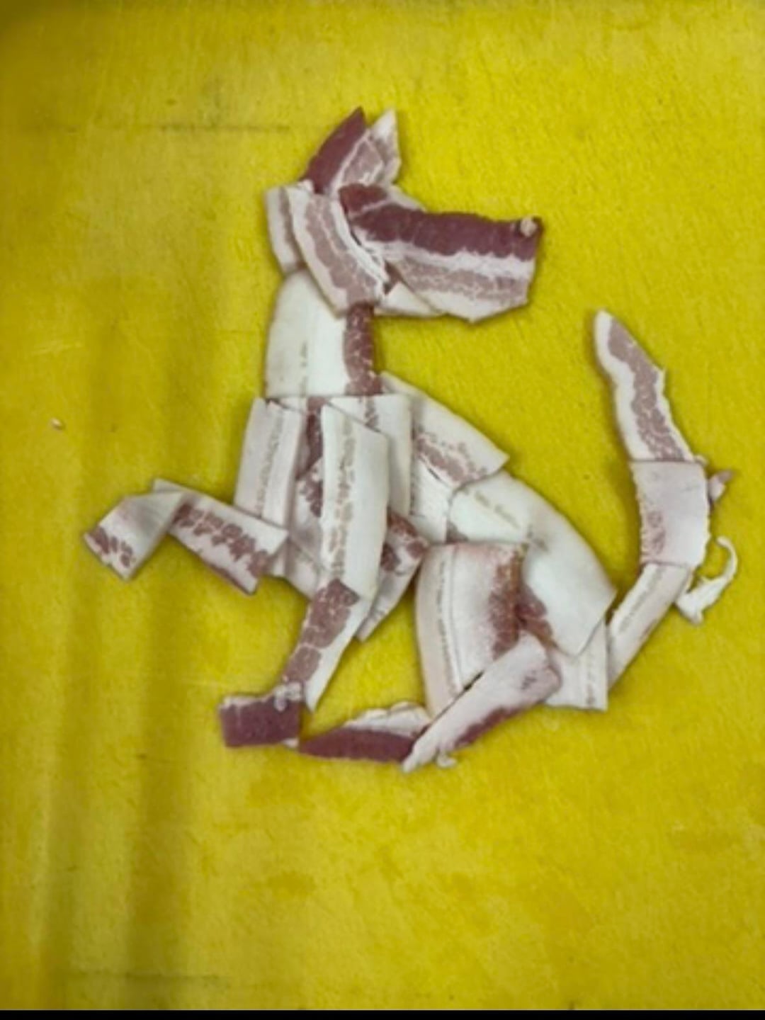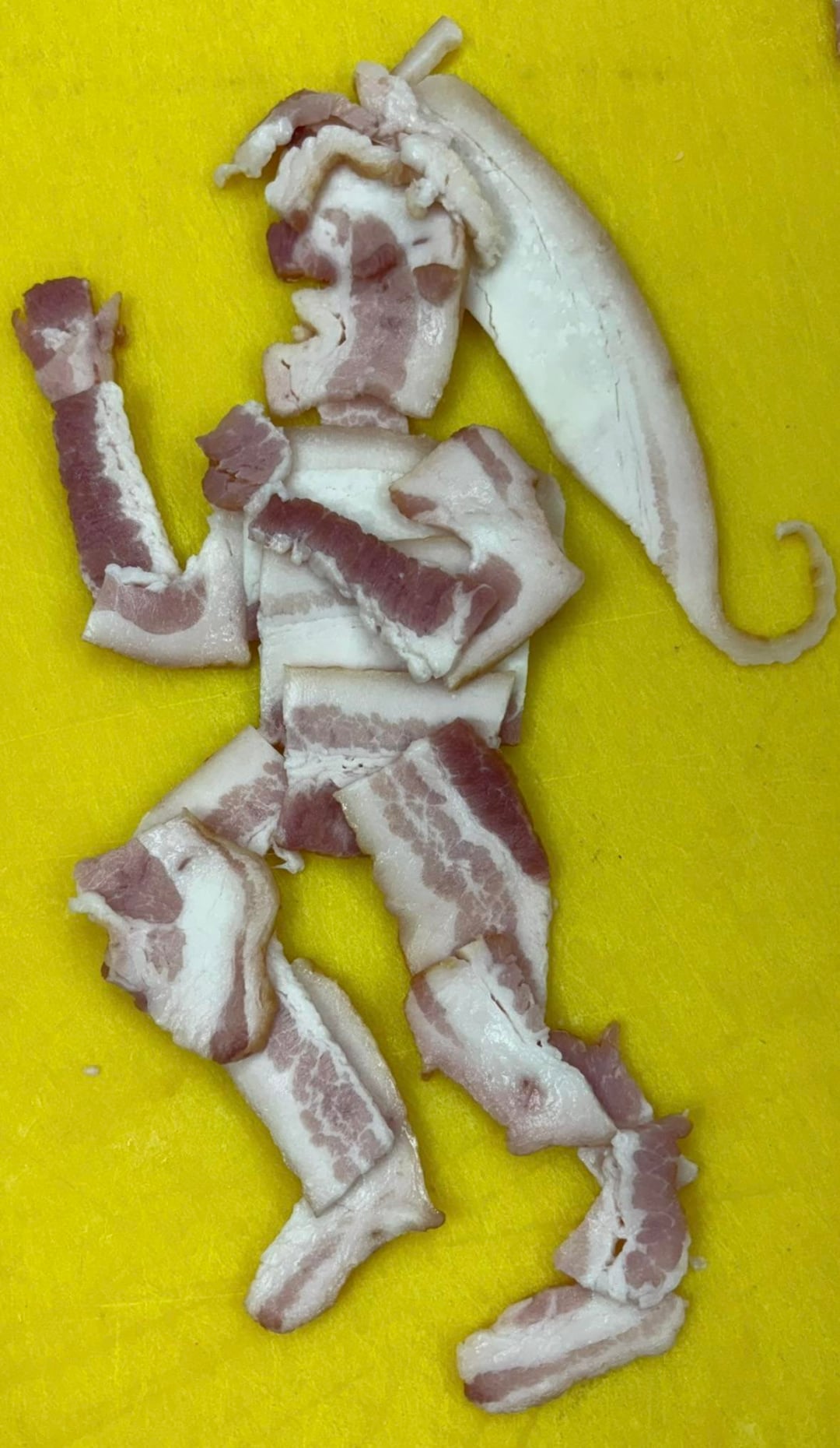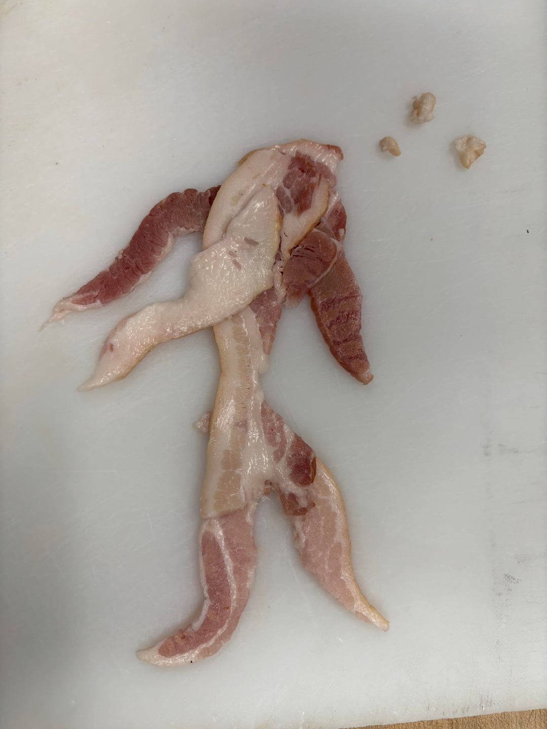 sometimes when we are a little slower and I have a couple extra minutes I’ll take a few moments to let the uncooked bacon speak to me and make some little animals and guys out of it. Coworkers and split between being entertained and horrified. It makes me happy.