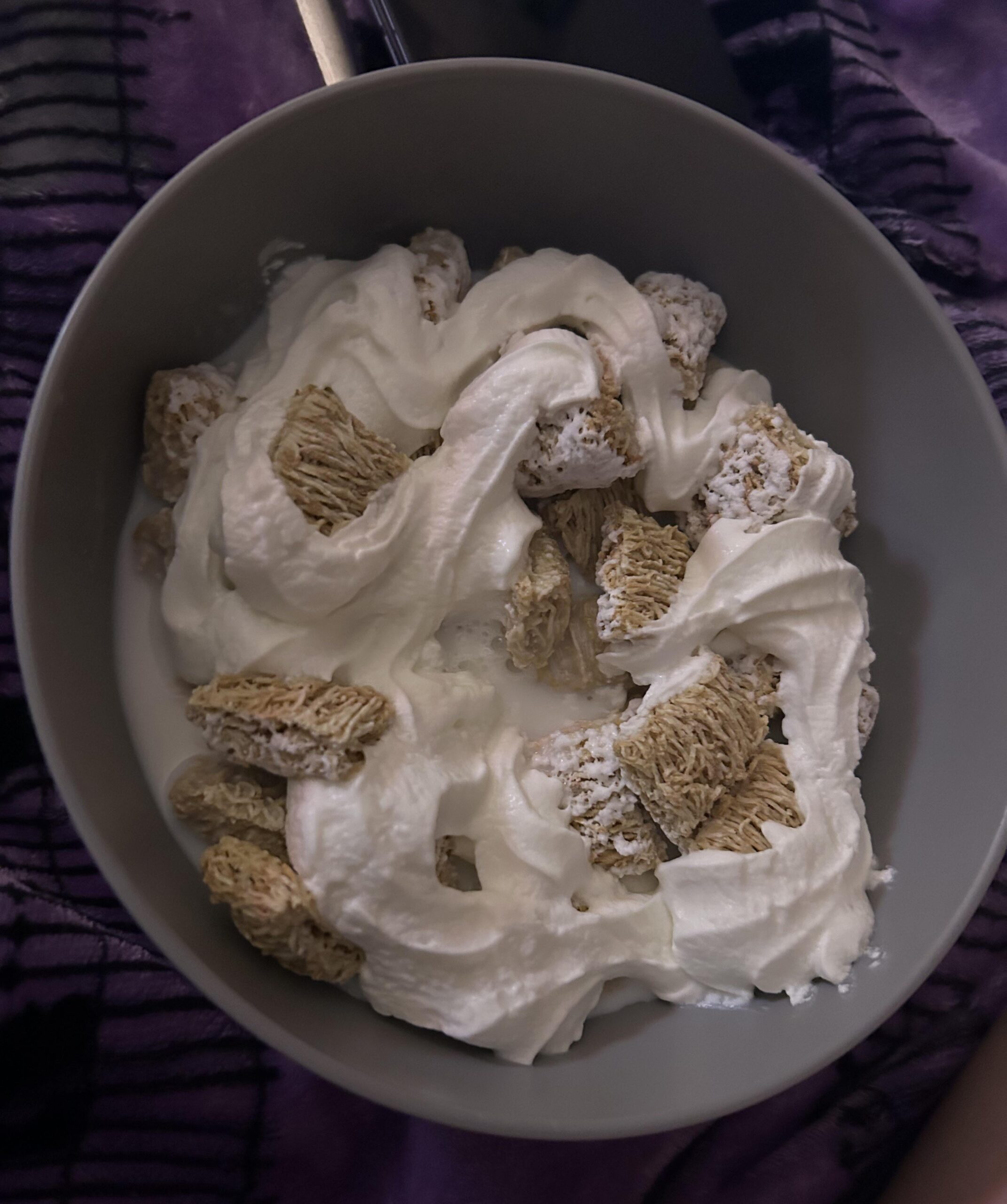 my boyfriend’s midnight snack. frosted mini wheats with whipped cream and milk 😭