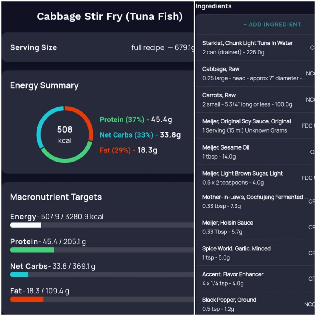 Instructions: prep everything separately. Mix all sauce ingredients and set aside. Thinly slice cabbage to your liking, grate carrot, and set aside. Open and thoroughly drain cans of tuna fish and set aside. Put the 1 tbsp of sesame oil in a large pot and heat on med/high. When oil is hot, toss in the tuna fish and stir. After a minute or so, pour in the sauce, stir, and then toss in your cabbage and carrots, stir. Add lid or cover and remove from heat. If eating while hot grab a bowl and the cabbage should be wilted just enough by the time you come back and should have absorbed some flavor but retained its crunch. I topped mine with crushed red pepper flakes and sriracha.
