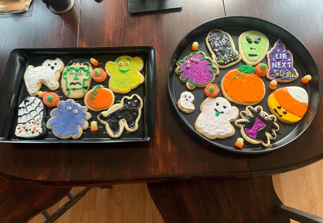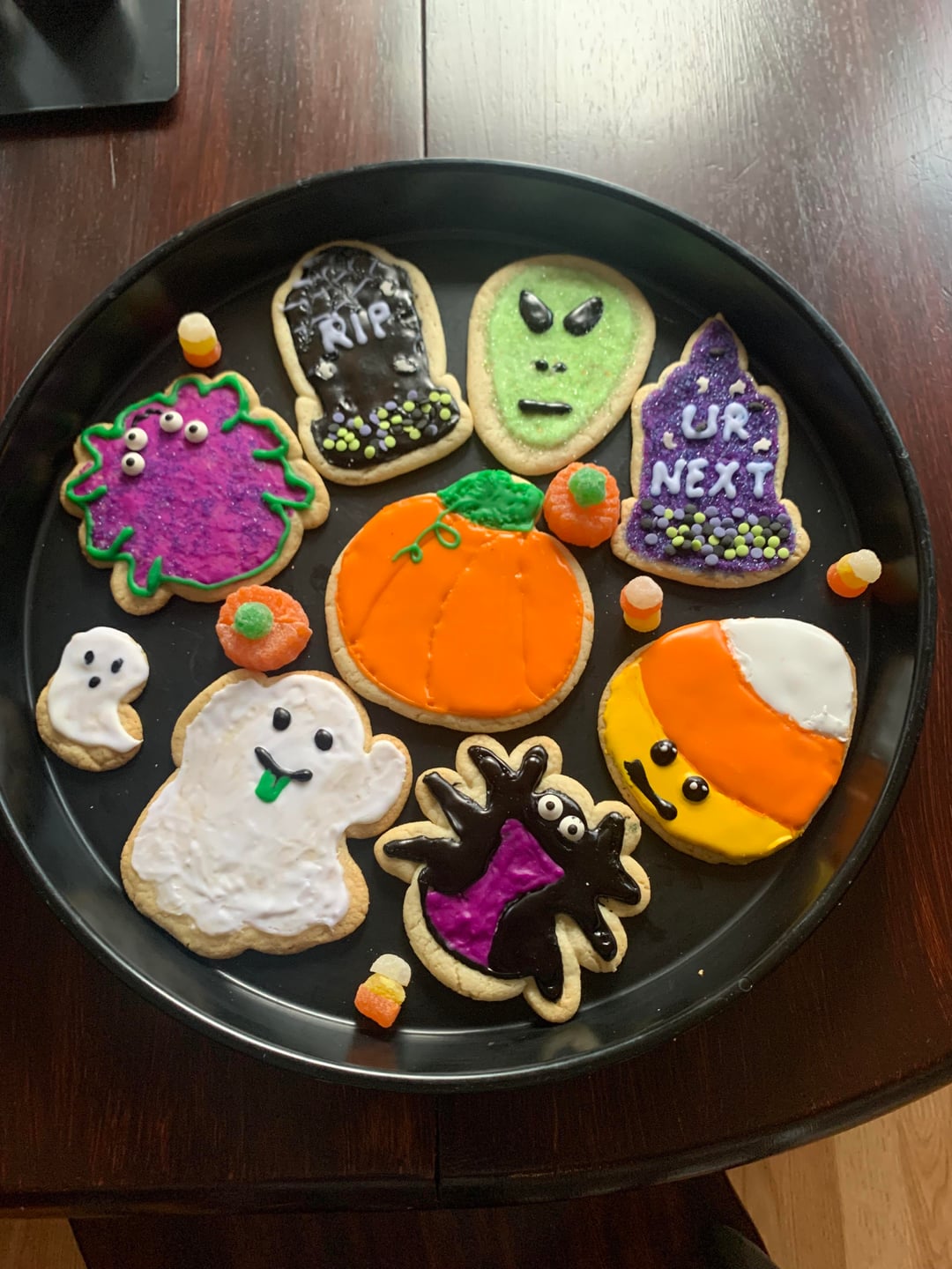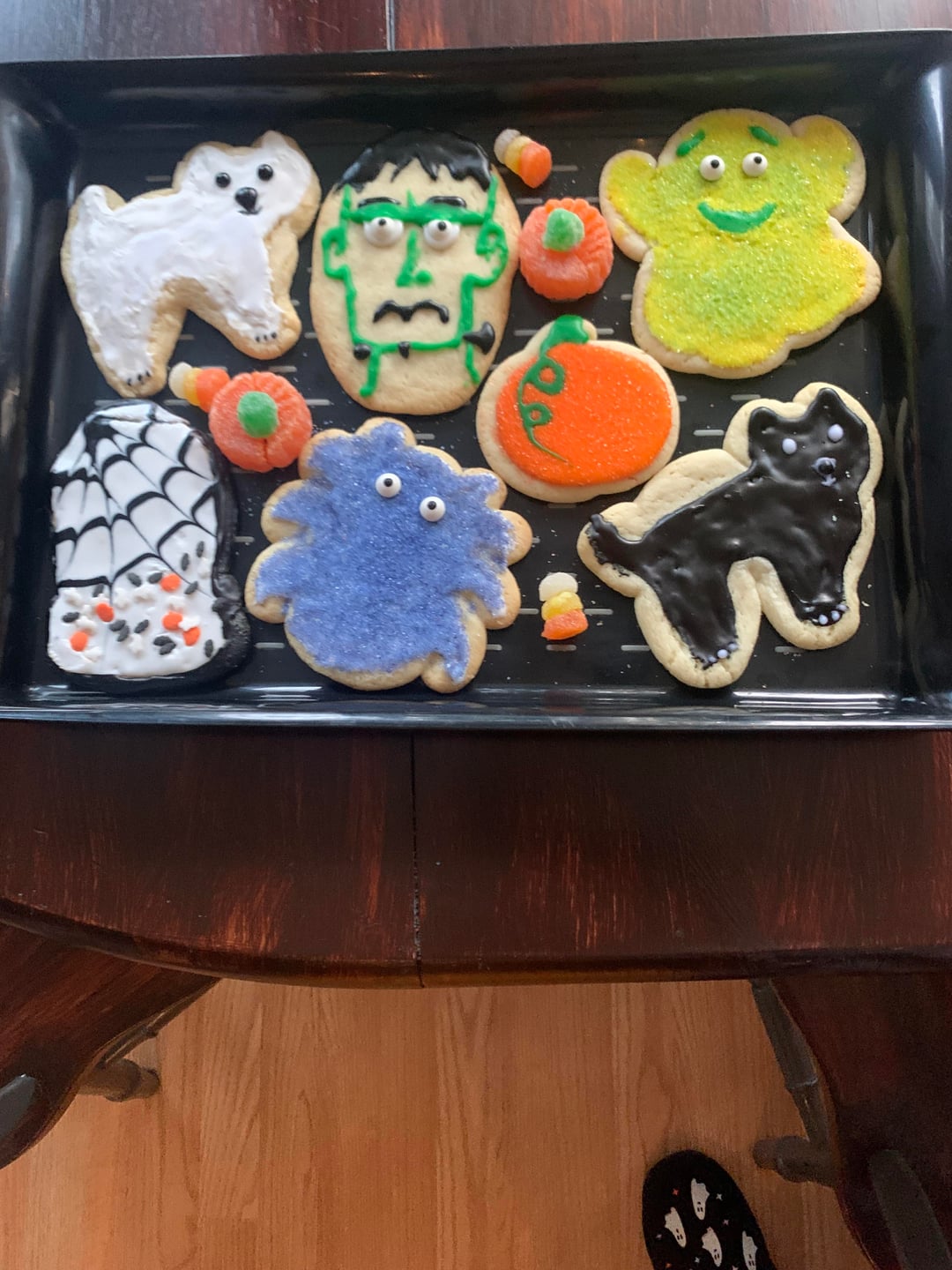 We baked these little guys on Saturday and just finished icing them last night, as well as adding some cut-up gumdrops and orange slices to make gummy candy corn and pumpkins on the first two trays.