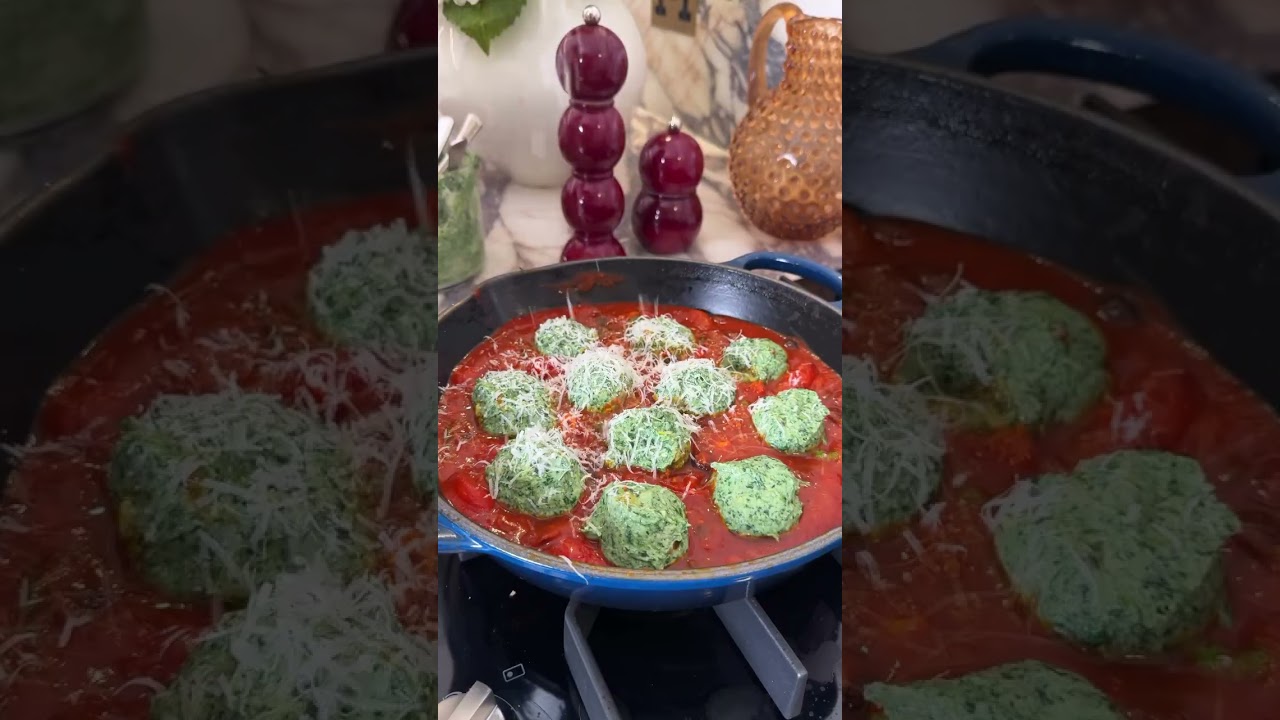 Guys, I don’t know about you, but I am so ready for comfort food season. And my spinach and ricotta malfatti with pinesesca sauce is such a winner. Essentially, think of these as giant fluffy noky but with loads of ricotta and spinach. They just melt in your mouth. This is actually a recipe that I had in my first ever cookbook. So good. But I just wanted to make it a little bit different using the pinesca style sauce with lots of garlic, chili, anchovies, olives, and capers. Using two small spoons, you roll the malfati into little balls. This is quite a wet mix, but trust the process. The balls will poach in a lovely tomato sauce. I actually like to flip these little malfatti over so they just get a lovely even cook. Top with extra palmesan, lemon zest, loads of fresh basil, and dive in. This is just a hug in a bowl for me. Leftovers also work really well. You can reheat them, and they’re also freezer friendly. Simple, but just so good.