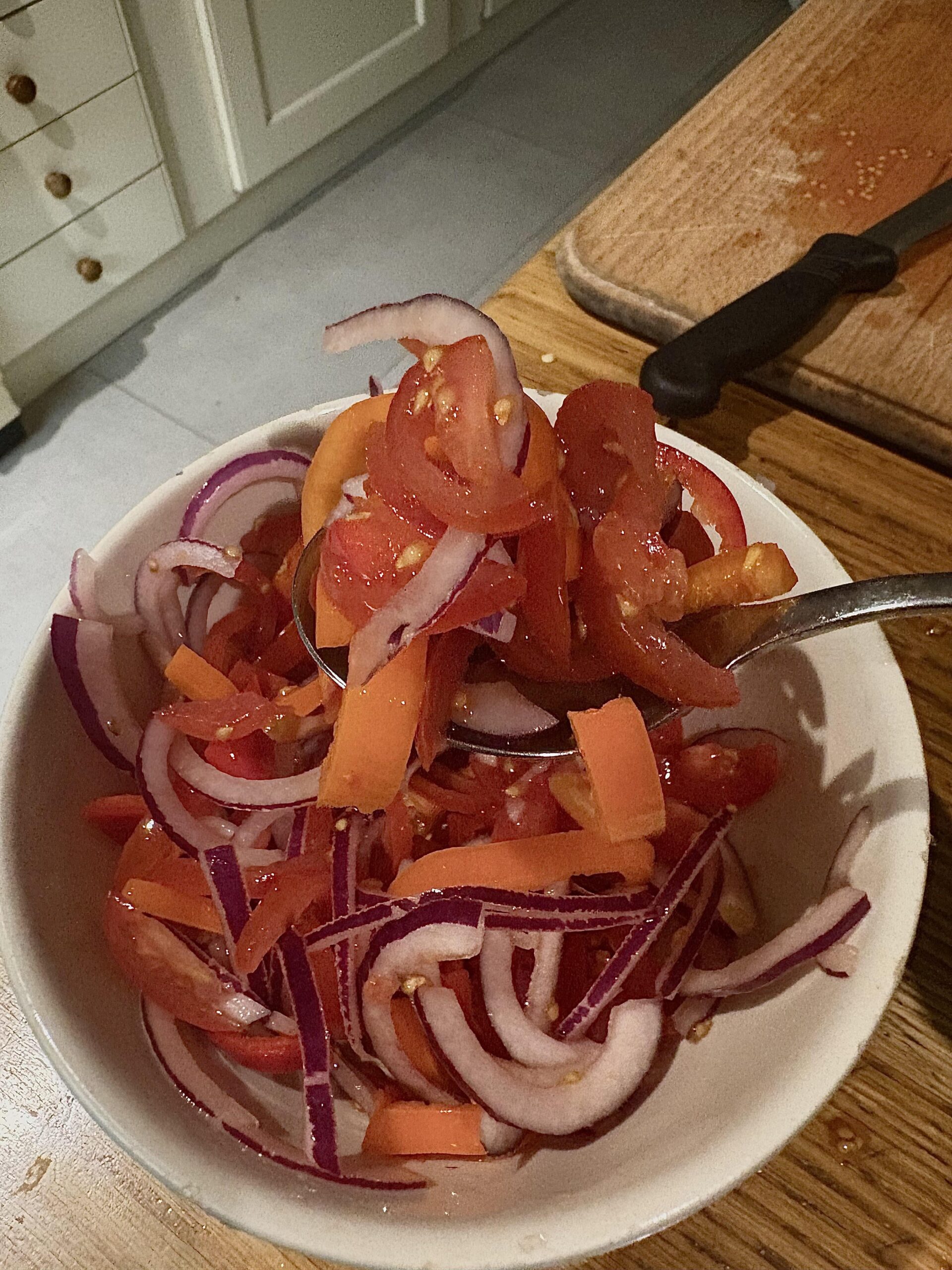 Red onion thinly sliced Cherry/plum tomatoes thinly sliced Bell pepper thinly sliced Lots of Malt vinegar Lots of Maldon salt