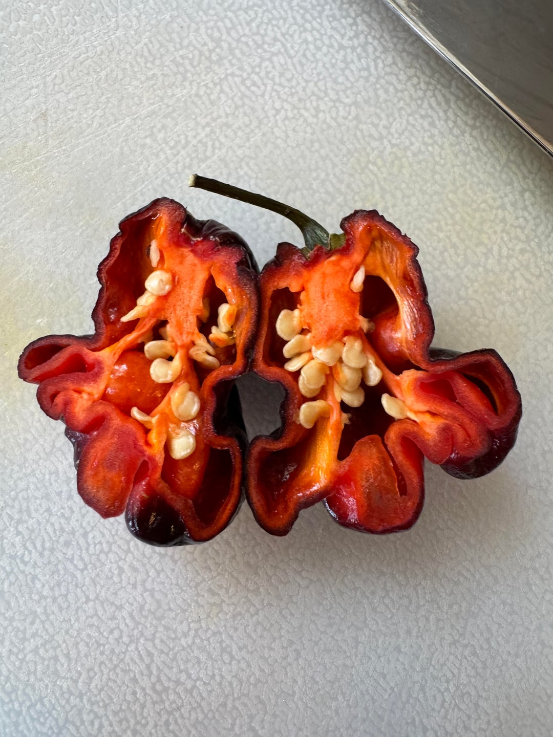 Ate about third of this raw and then another third chopped up in a tuna melt. Remaining third, who knows. Absolutely the hottest one I've had. I only got 2 Carolina reapers and 2 of these this year and these are so much hotter and also better tasting than the reapers. This was my last raw pepper from a kinda disappointing season but so worth it and a good way to wrap it up