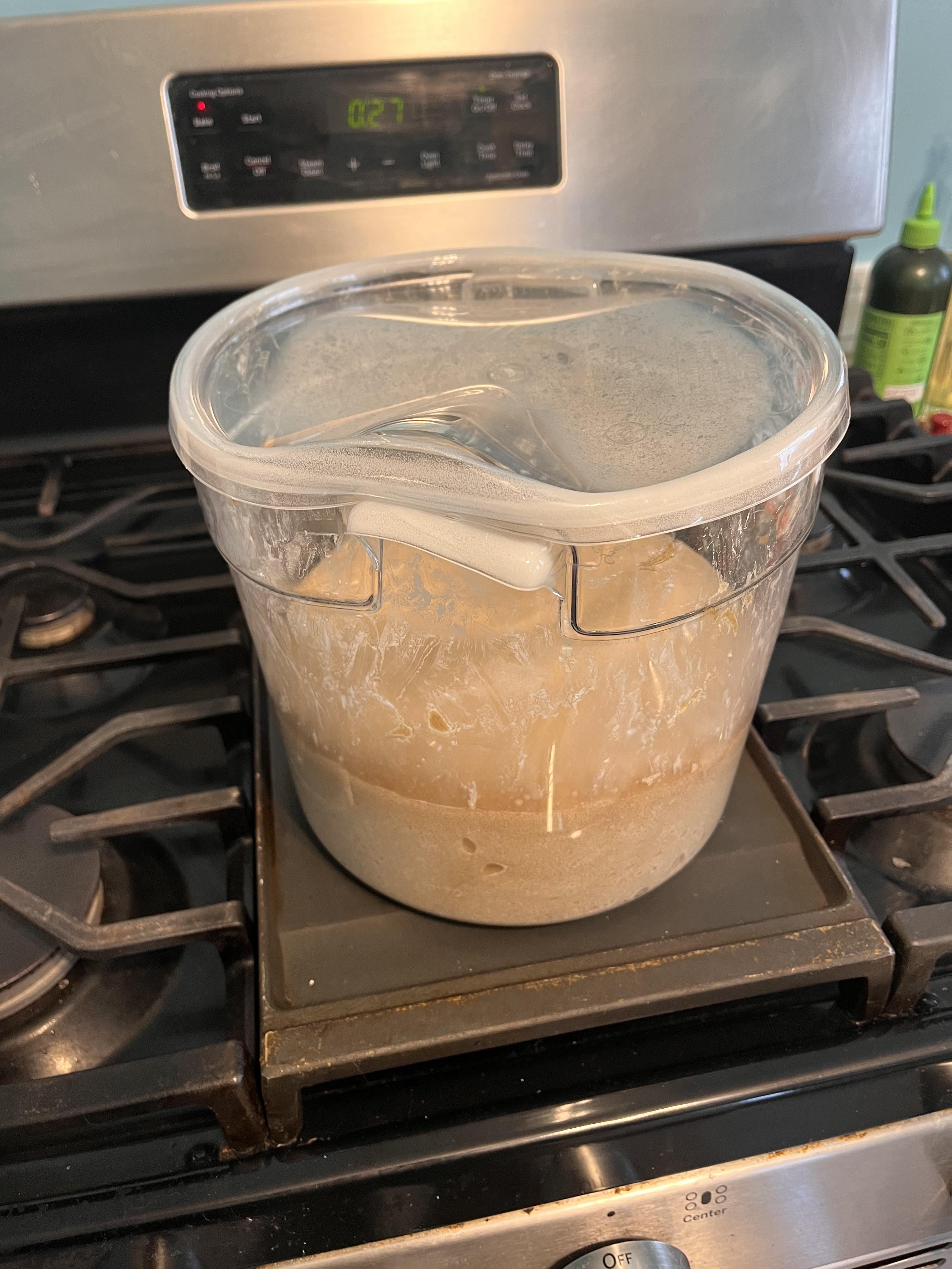 I bought a two pack of buckets from Sam’s club, washed one that night, and then did this the next morning while making bread. And I swear I turned on the oven, never moved from that spot, listened for the gas to “whoosh” when it lit, then turned it off, so I have no idea how it melted so quickly.