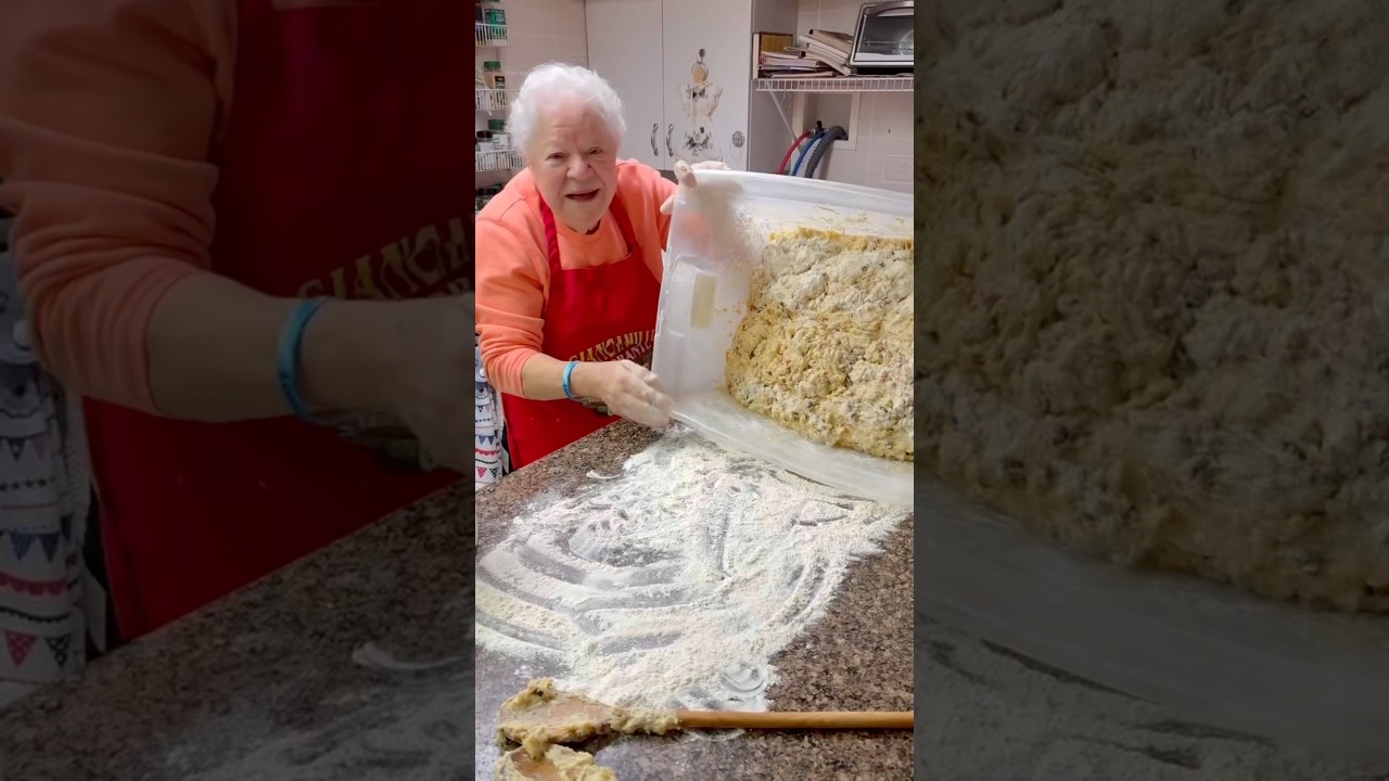 And I think it’s a big bunch. There’s the eggs. Seven sticks of butter. This is the fruit that we’re going to put. And it’s been marinating for a month. Now we’re going to throw in the eggs. All 40 of them. Fruit is in there. The butter, the milk. Now it’s going to get better. We’re going to dump it onto the table to knead it. Now look it. Wow. That’s a lot of dough. Nona’s back on her stool. Yes, I could reach to punch down cuz you got to really make it long. You got to get up on a stool to get on top of it. And here, look how much there is. It’s going to It’s coming together. Wow. How long do you have to knead it, Nora? Uh 8 to 10 minutes. Maybe this is such a big bunch. A little longer. And now we’re rolling it into the bin. where it has to rest for an hour, an hour and a half, maybe two cuz it’s such a big bunch. And we bless it. One, two, three. Three crosses. Yes. And we have to flip it. Oh, maybe I’ll just put some on top cuz it’s too big to flip it. I can, you know. We’ll take a picture when it’s come up. How far do you think it’s going to come up? To the top. Halfway. Wow. If it’s half, it has to come up to double. All right. We’ll check it later. Yep.