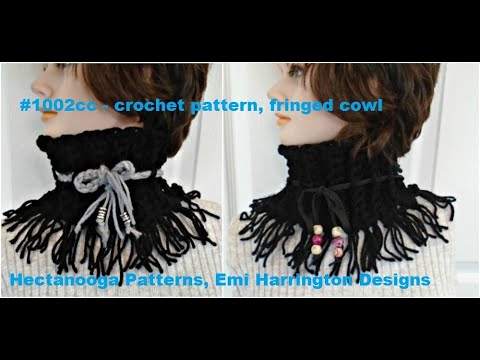 This easy ribbed look cowl is a one row repeat, works up very quickly, and makes a lovely gift! I used chunky yarn and a 9 mm crochet hook, but you could use 2 strands of ww yarn. (For a more lightweight cowl, use 1 strand of ww yarn and a 6 mm crochet hook.) Start with a foundation chain in any length (worked sideways), and then single crochet across each row, working only in the back side of the stitch to form a ribbing. Work a rectangle of 22 – 24 inches, then slip stitch to join into a tube. If you wish, add fringe with a larkshead knot as shown in the video.