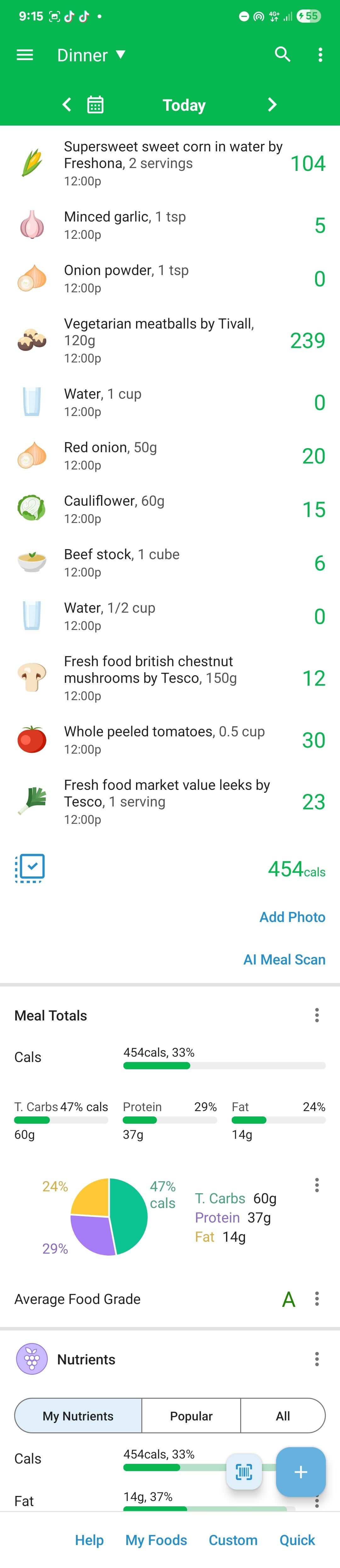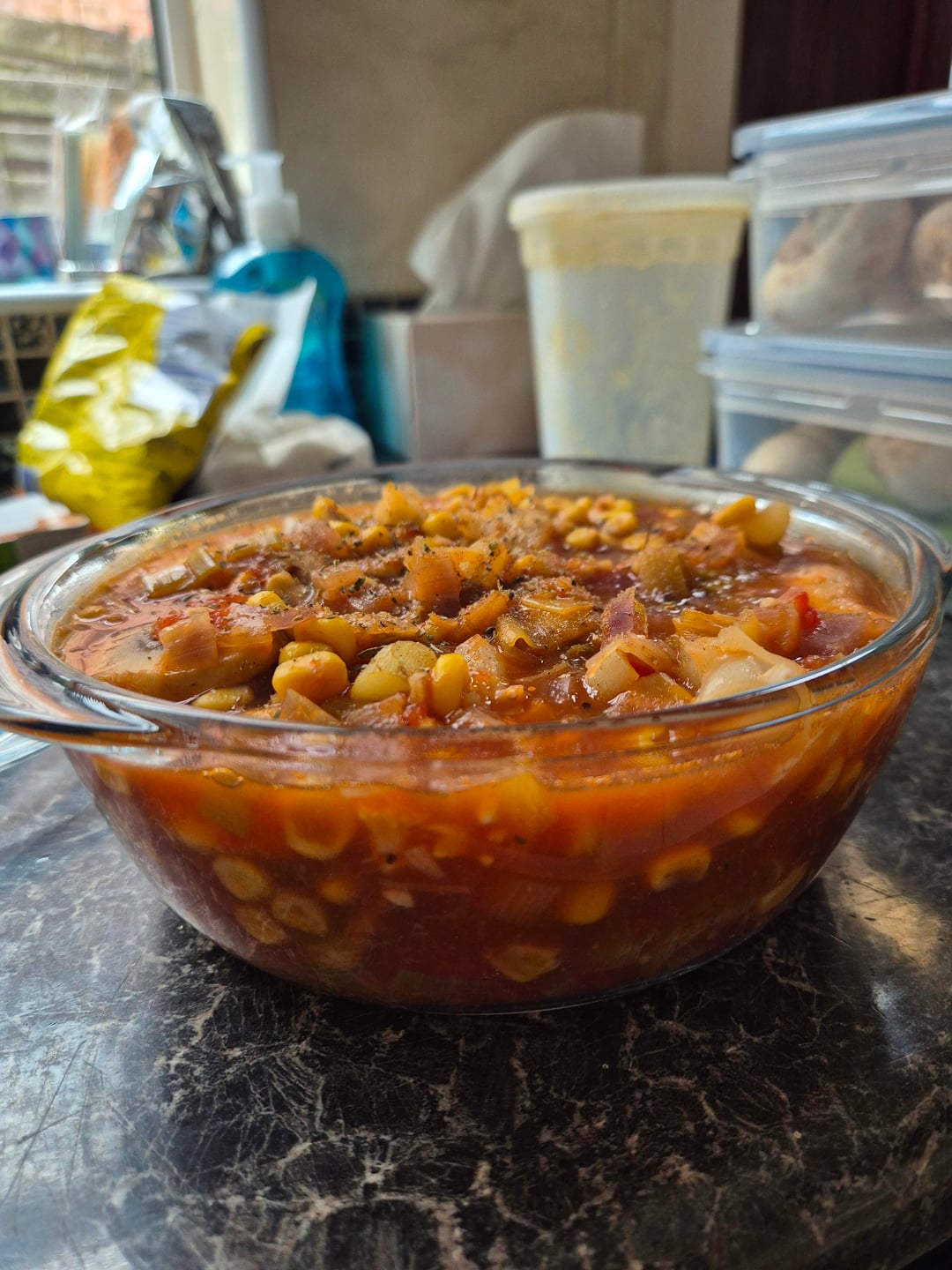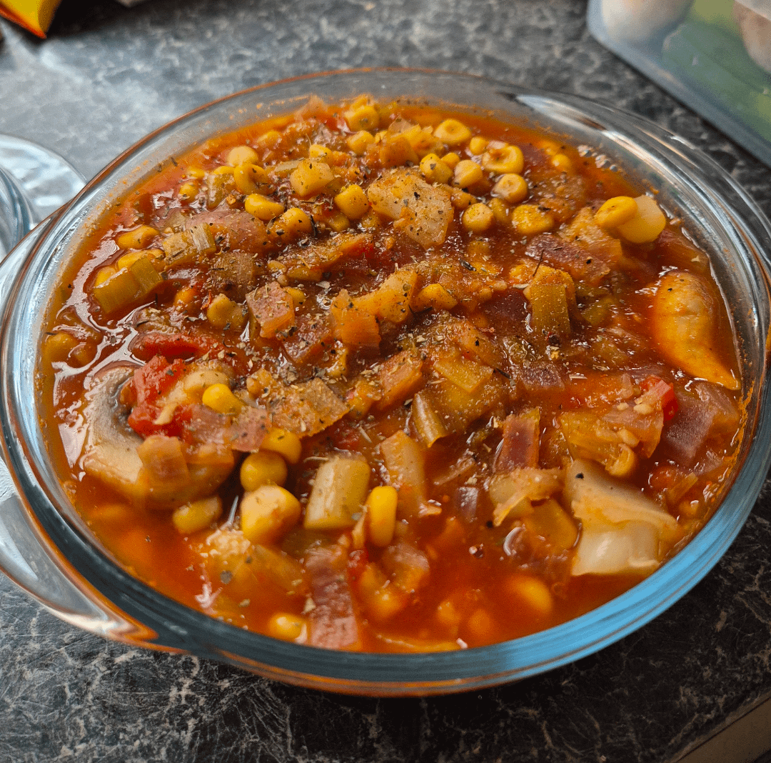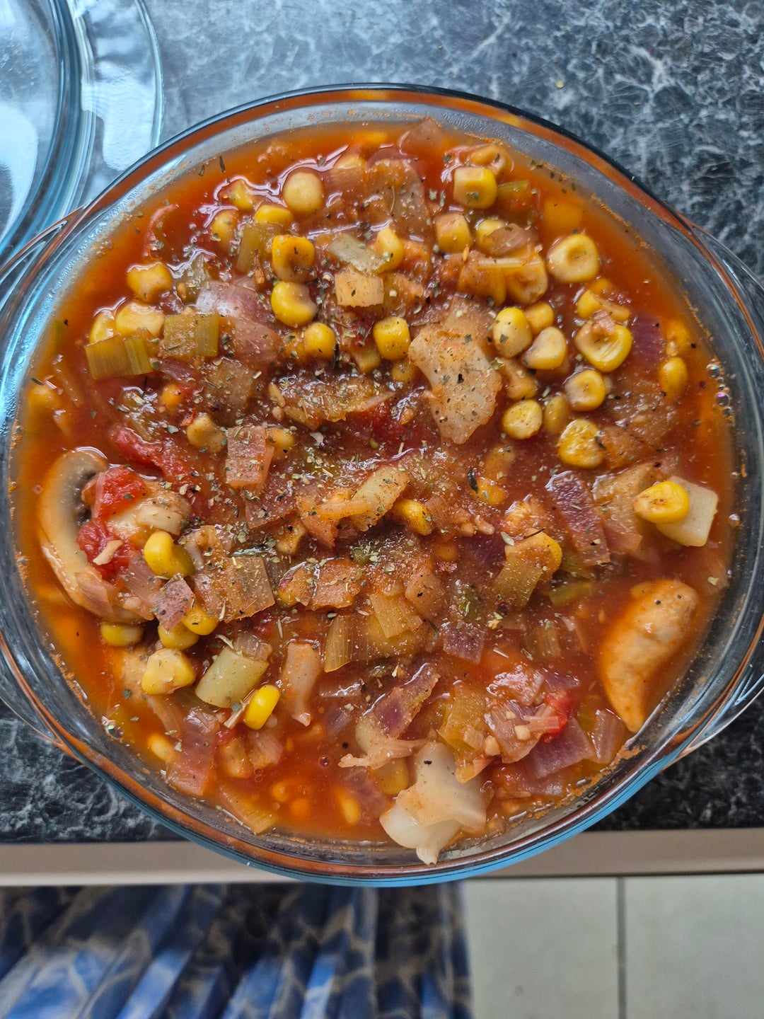 I started by cooking the corn on dry heat in a saucepan, then added the leftover corn juice (i used canned corn) onion, tomatos, leeks mushrooms, cauliflower, seasonings and mix for a bit (like 5 – 10 mins?) before adding beef stock mixed with 1 cup water, then the meatballs and let it bubble. Mix and add another half cup water. (I've found this to be the best water to veg ratio for the soup; not to much, not to little and not to thin either.) I feel like the longer it cooks, the more flavour there will be. (Don't overcook tho, u don't want all the water evaporating)