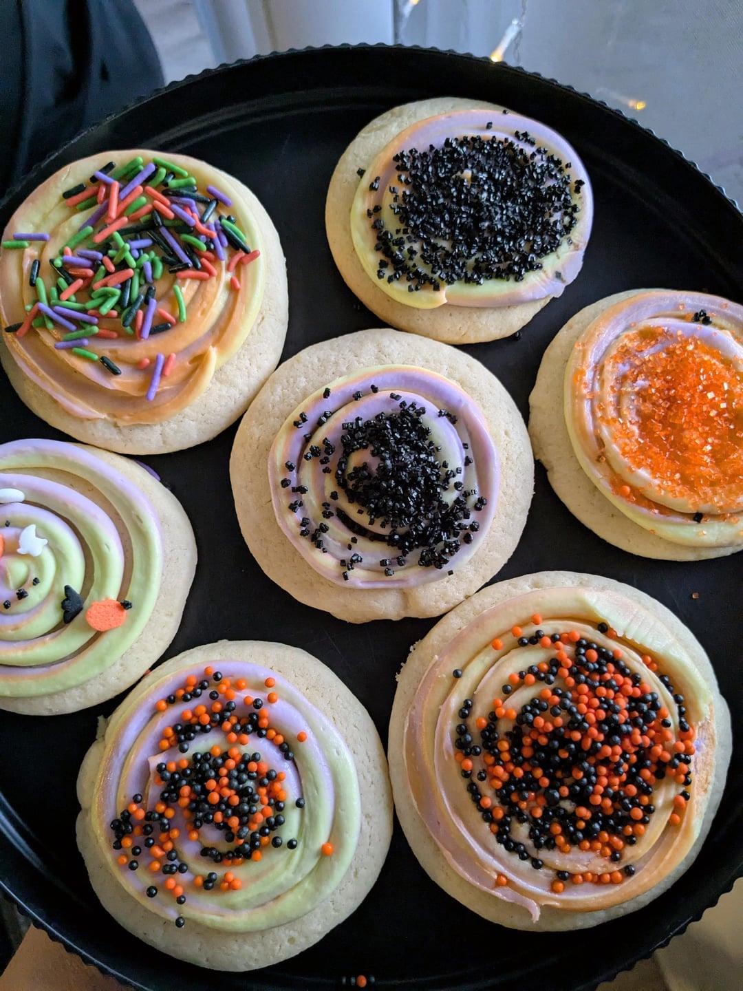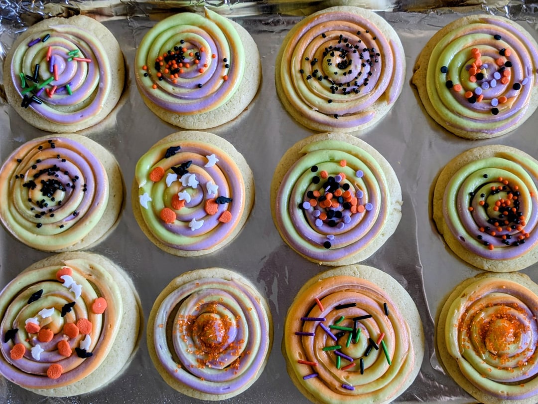 Made some lofthouse style cookies for Halloween. First time trying a tye-dye effect with the buttercream. I kinda wish I added a little more gel though since I feel like the colors are really muted 😩 can you tell which one's my toddler decorated? 🤣