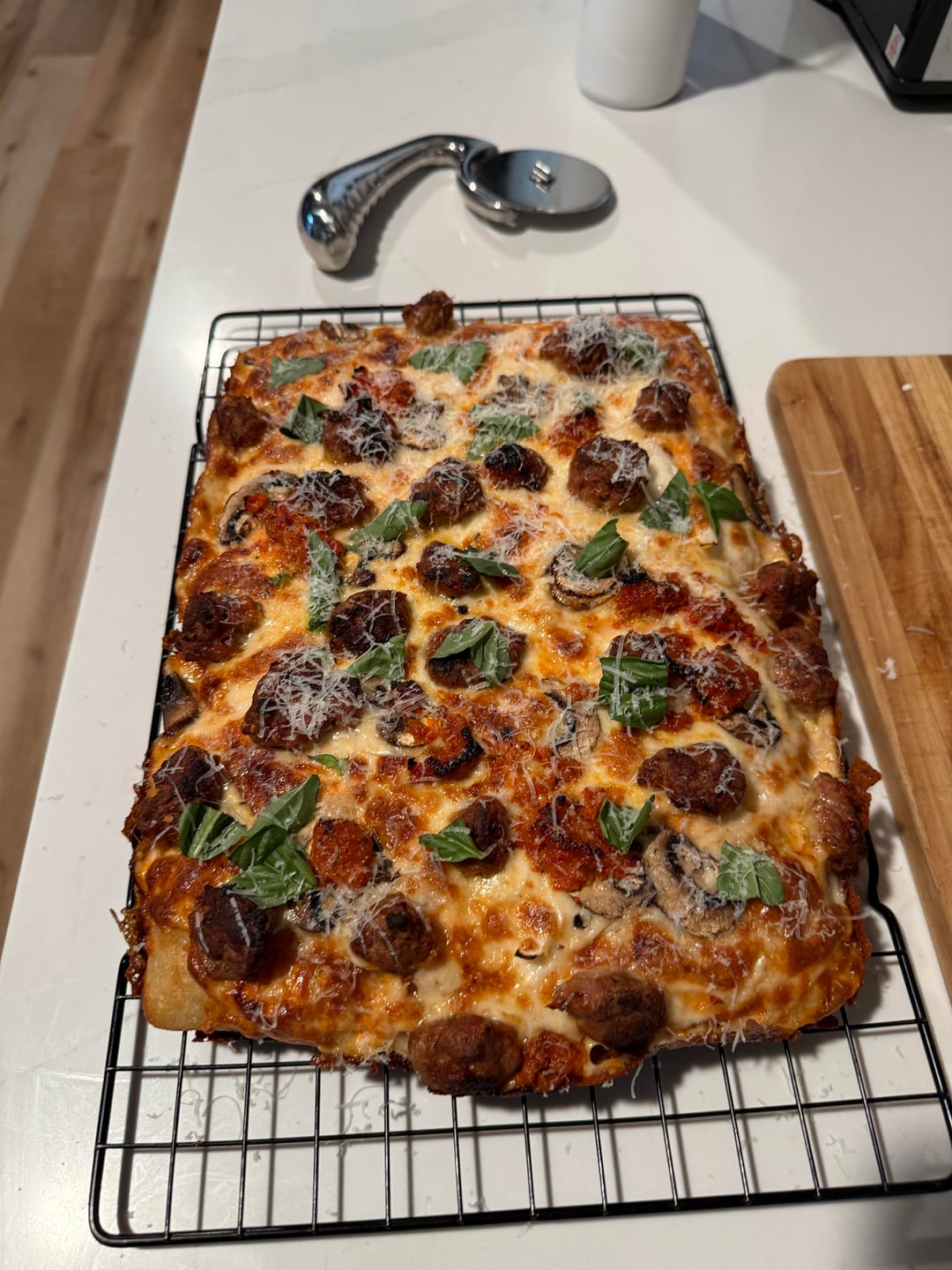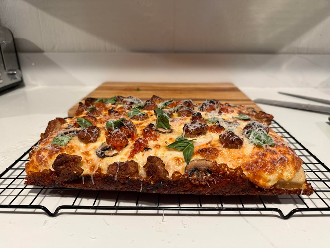 Tried out a new dough recipe, really happy with the outcome.This one had homemade red sauce, sausage, red pepper pesto and basil with some Romano on top.by hdub499 Dining and Cooking
