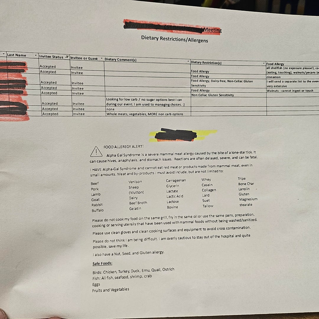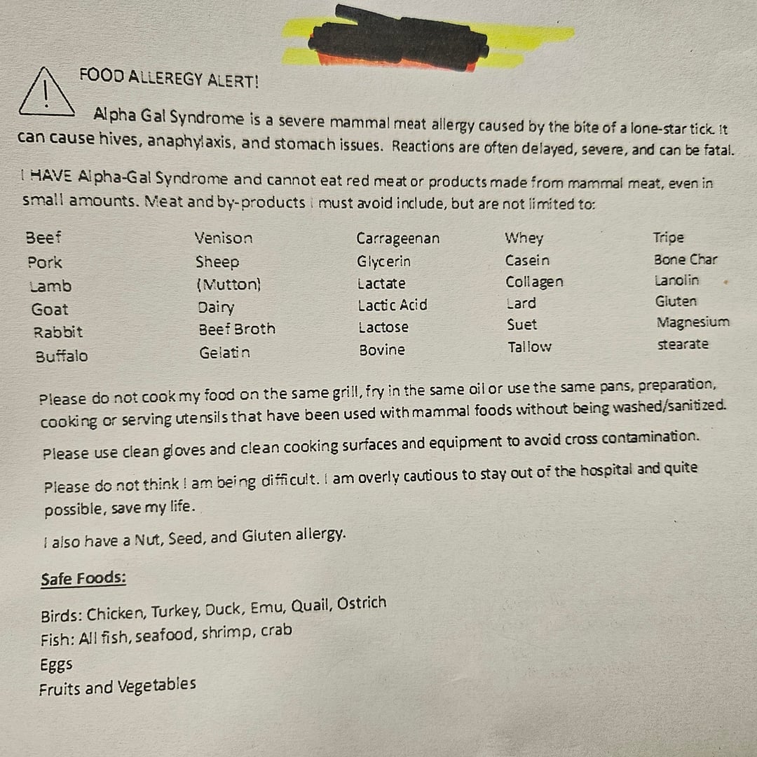 I think accomodating a person who has both alpha-gal syndrome AND avoids gluten AND nuts sounds extremely difficult to achieve in restaurant setting.