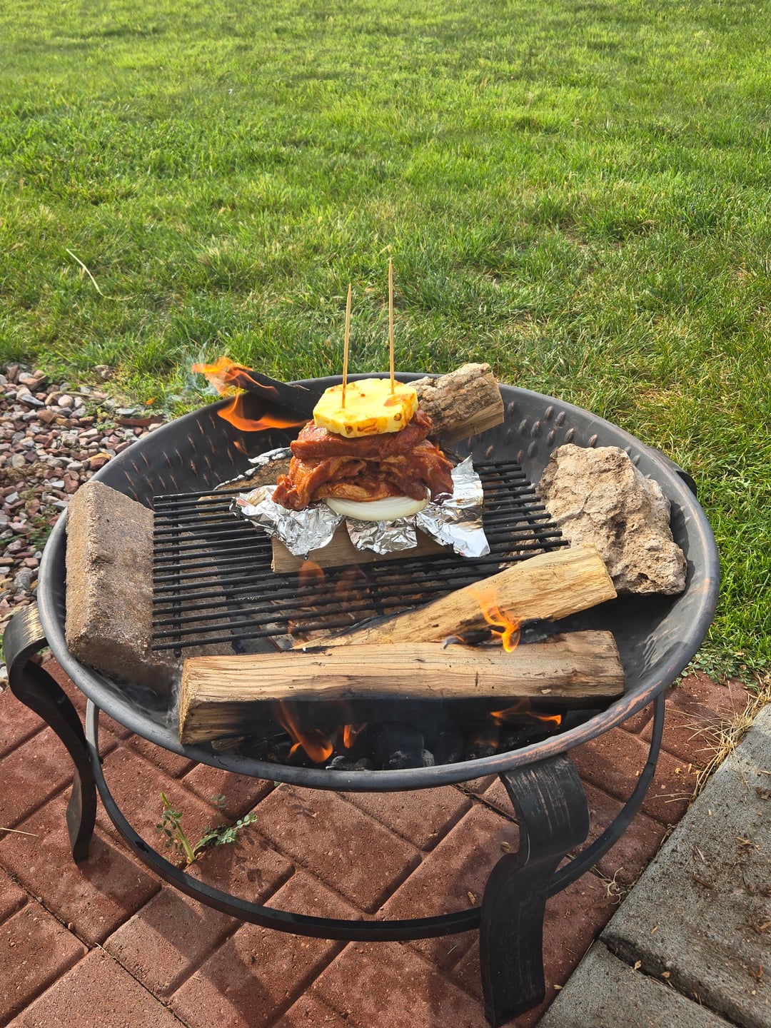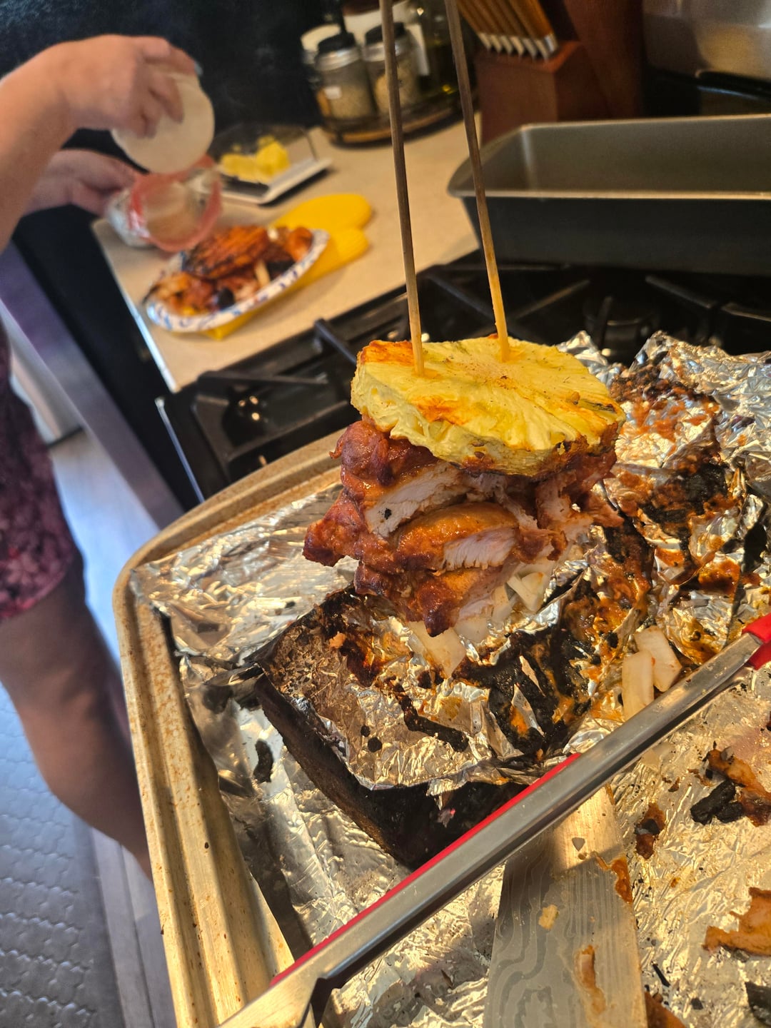 Credit to u/mr3vac for the inspiration. Marinated, stacked, cooked over the fire with a pineapple on top. Served with a Kona.