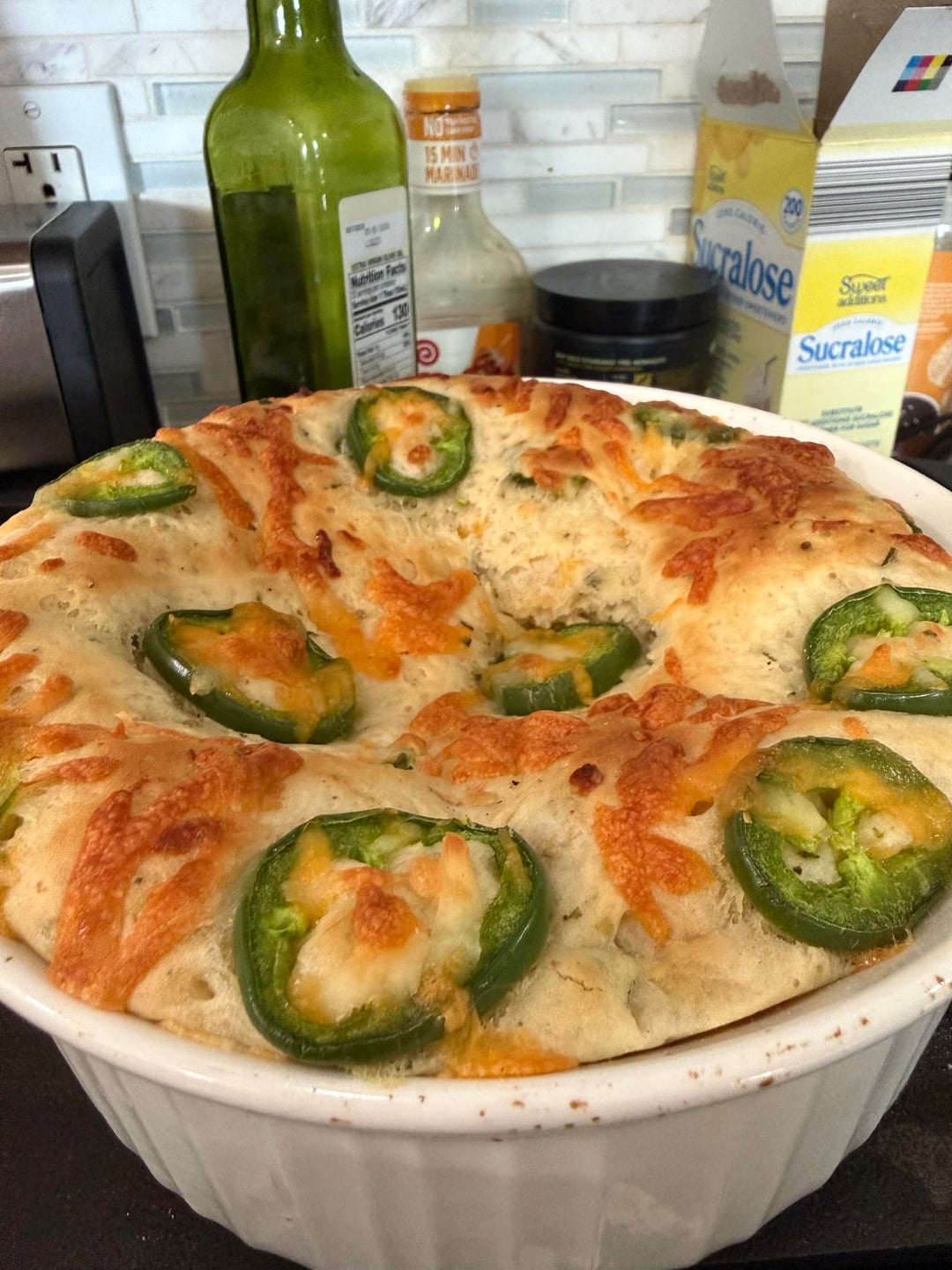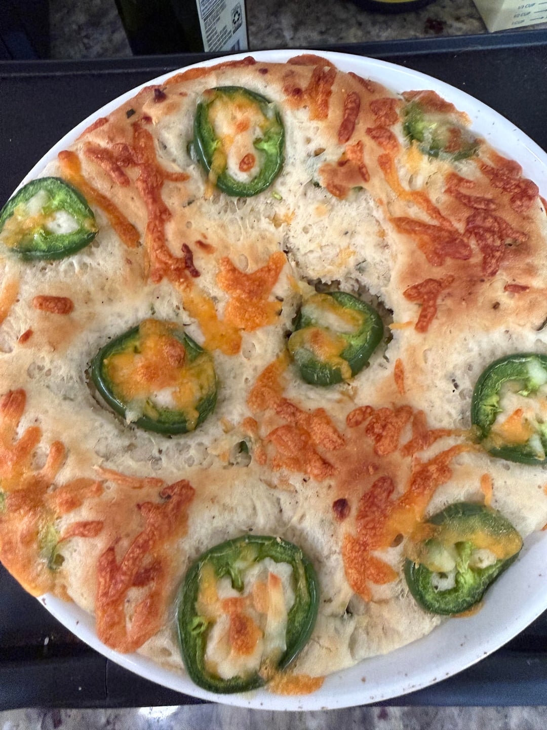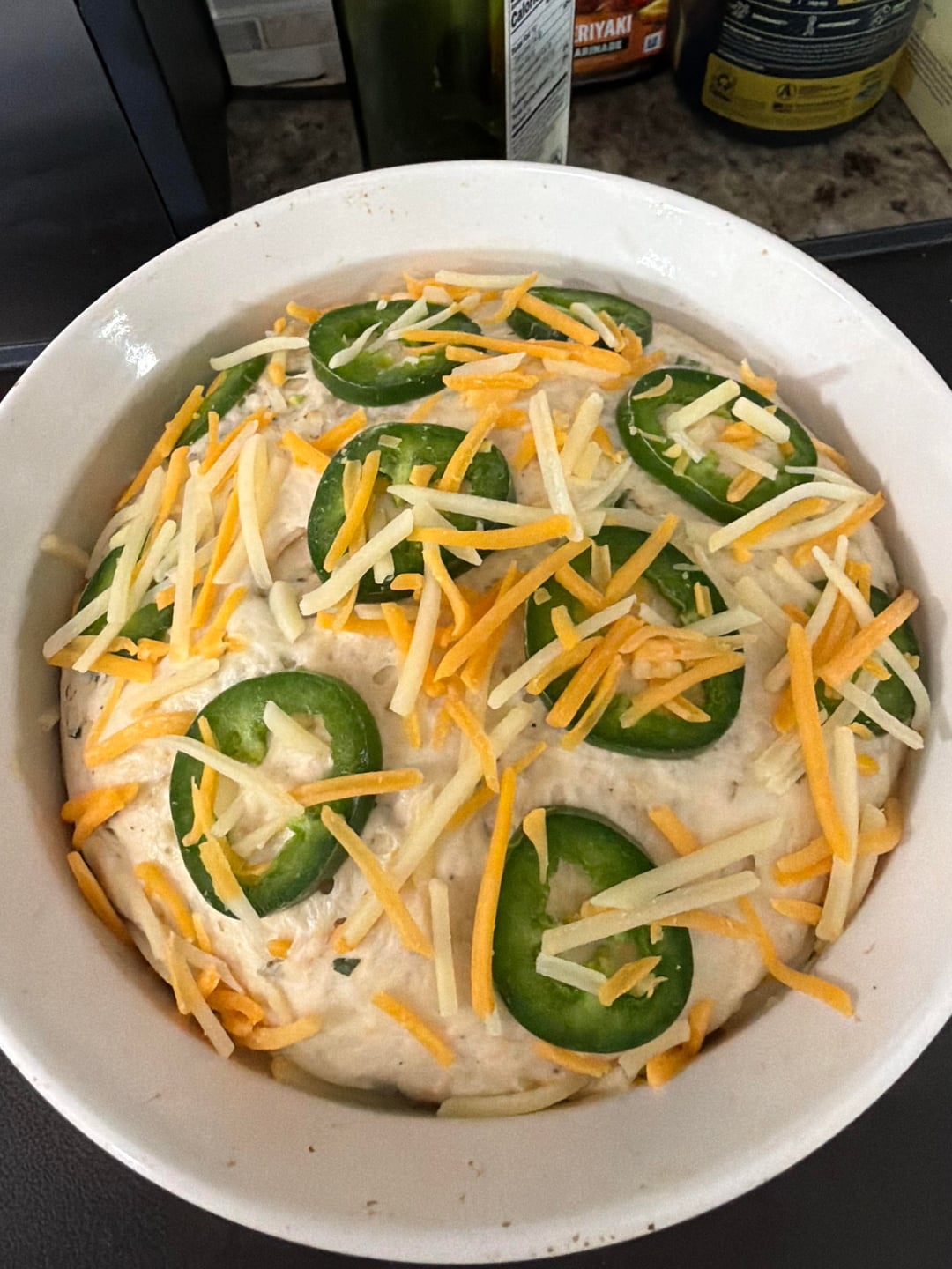 Those jalapeño slices are too thick. You need to make them a lot thinner. They’re all weighing the loaf down.