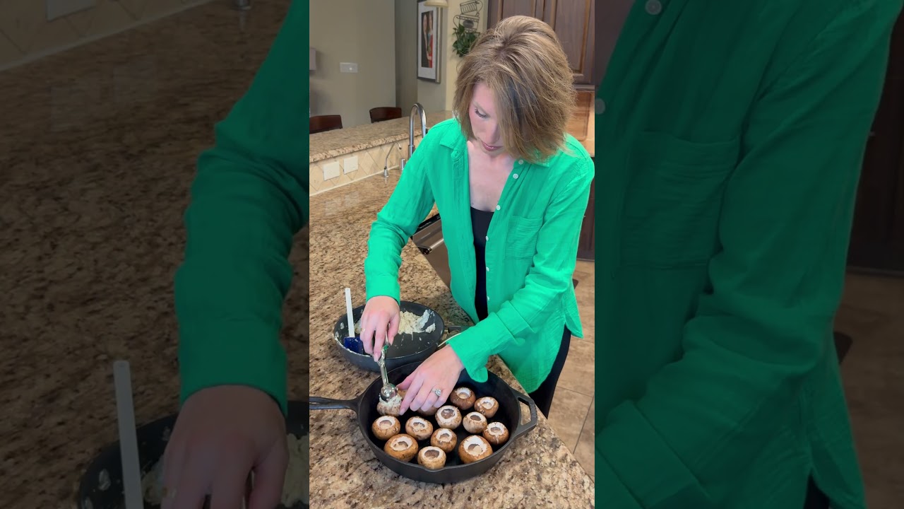 These stuffed mushrooms may just be the best ones you’ve ever had. They are perfect for holiday parties or for game day. And they are so easy to make. First, you’ll clean some button mushrooms really well. Then take out the stems. Place the caps in a greased bacon dish. Then chop the stems up super well. Heat olive oil in a skillet. Then once it’s hot, add the stems and some fresh garlic. Cook it for about 5 minutes. Then turn off the heat and stir in boren cheese and parmesan cheese. Once that’s combined, fill each cap with the cheese mixture. Now pack it in just a little bit. Then to the same skillet, add more olive oil and toast panko breadrumbs and fresh garlic. Once it’s lightly browned, sprinkle it on top of the mushrooms. Then bake at 400 for about 15 to 20 minutes or until the mushrooms are tender and the filling is golden brown and bubbly. Sprinkle on some chopped fresh parsley and a sprinkle of seasoning salt or salt and black pepper and you’re all set. They’re cheesy, crispy, and downright addictive.