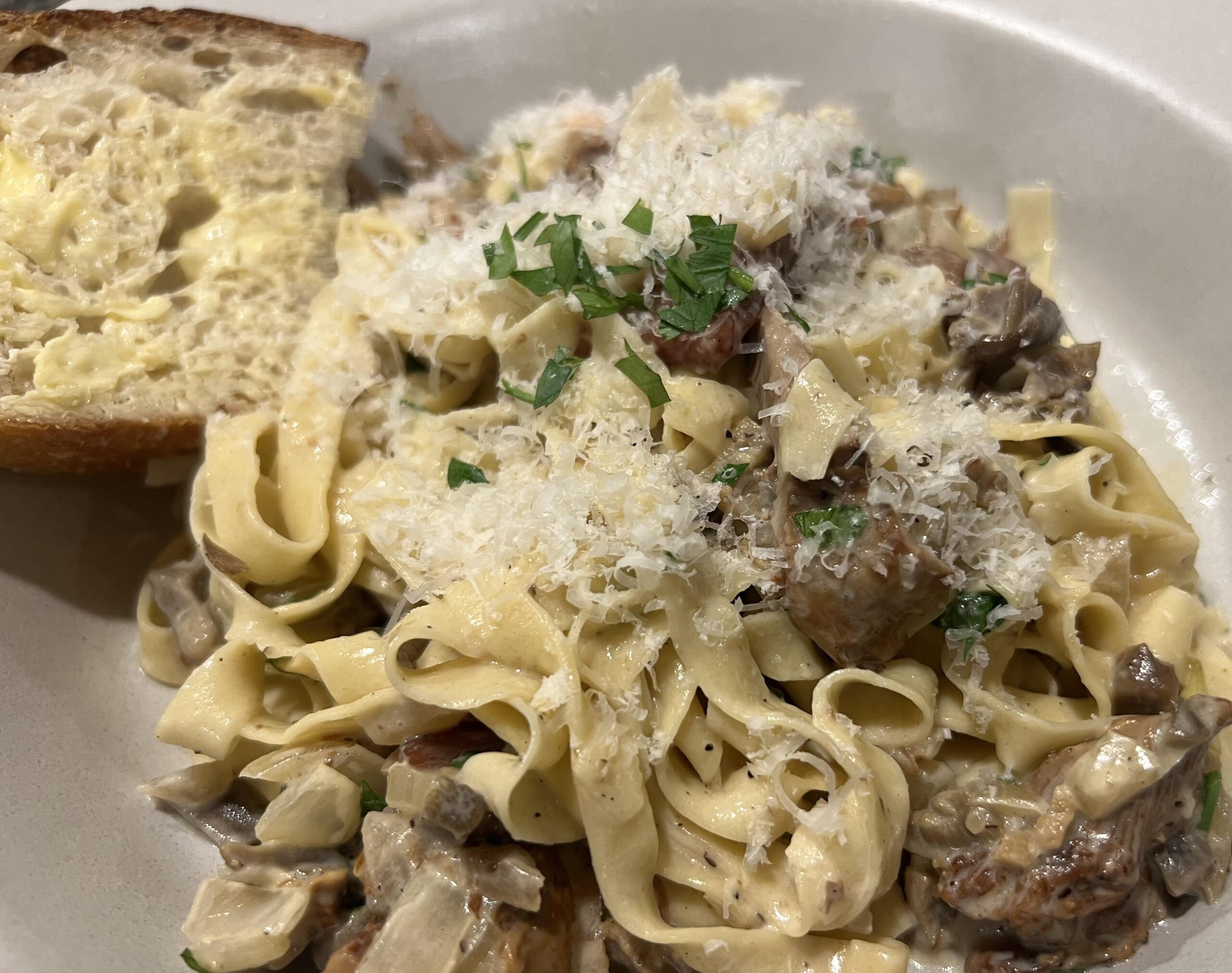 Porcini, chanterelles, and lobster mushrooms cooked with homemade bacon, cream, and fresh pasta (some homemade sourdough for good measure). Big beautiful flavors (though not exactly colorful). by Flat-Tiger-8794 Dining and Cooking