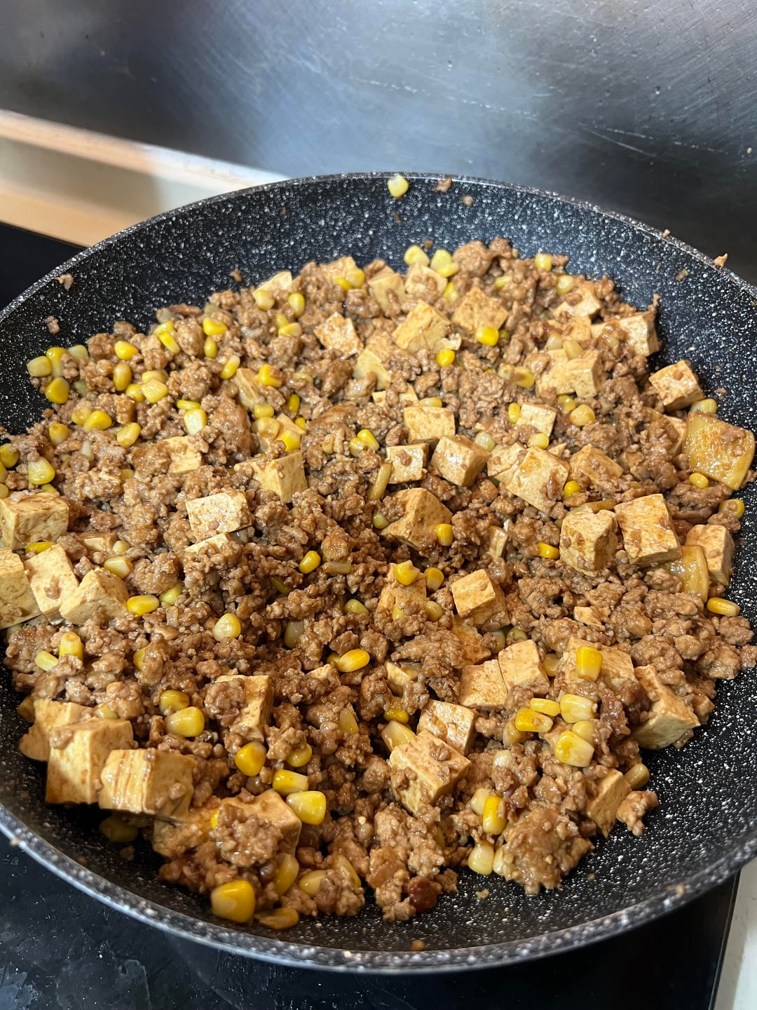 – Pan fry the meat and throw tofu/corn in afterwards and stir in sauce. Add some water if it looks a bit dry