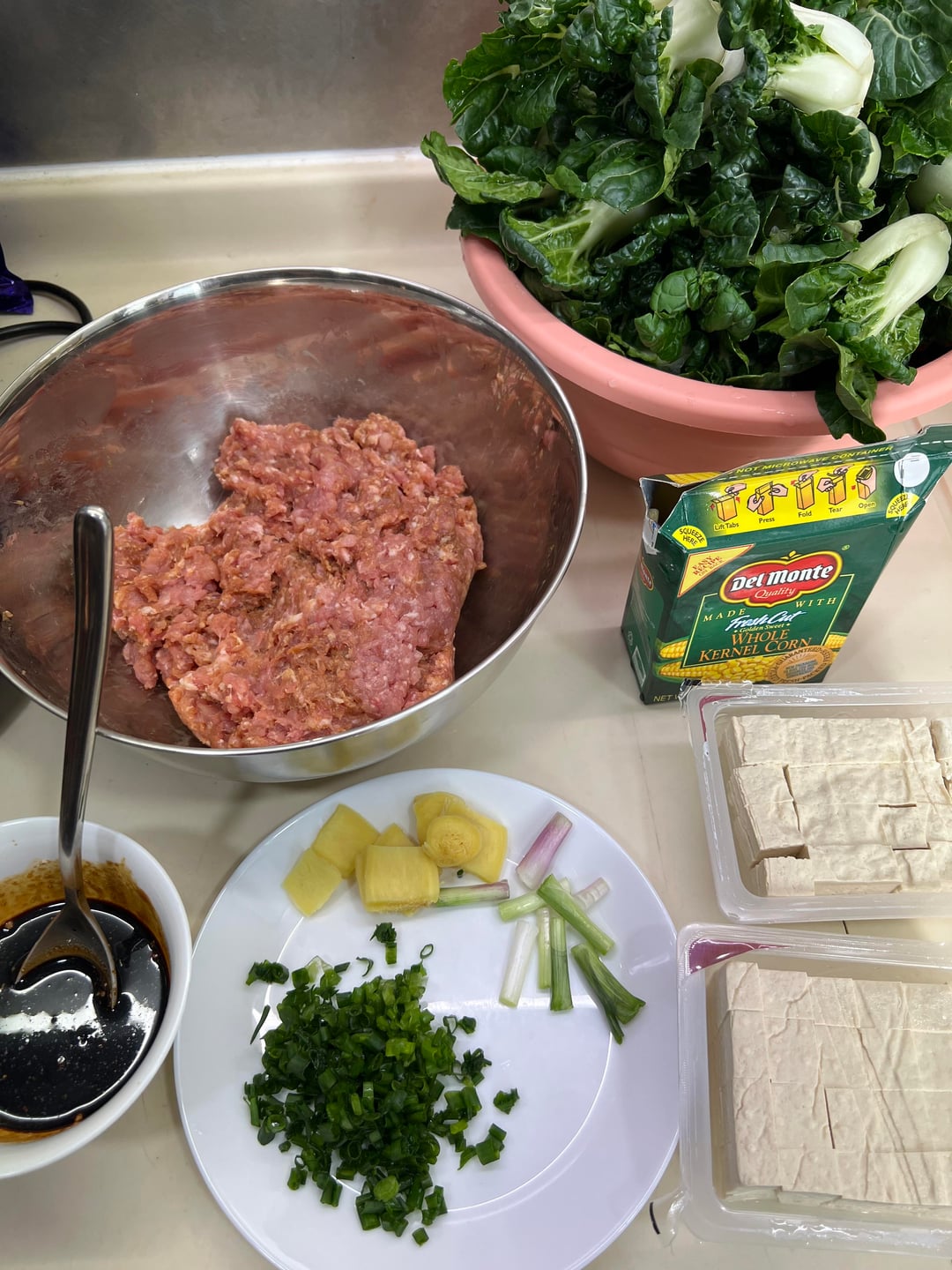 Preparation – Marinate 1kg minced pork in 3tbsp cornstarch, 2tbsp cooking wine, 3 tbsp soy sauce, 1tbsp dark soy sauce – Dice 500g of firm tofu – One box of whole kennel corn – Prepare sauce of 2tbsp soy sauce, 1 tbsp dark soy sauce, 1tbs oyster sauce, 2tbsp cooking wine, 2 teaspoon sugar, 2 teaspoon chicken powder – Slice a few pieces of ginger and dice scallions