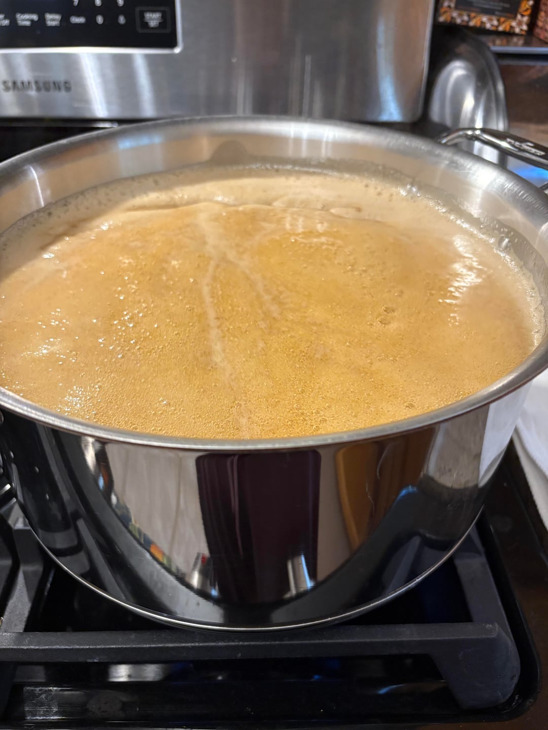 Photo Five: A stainless steel pot is filled with foaming corn syrup and brown sugar at a boil and frothing like an angry dragon. In other words… “Why you need twice as much pot as you think you do.” (If you’re a candy maker, you know what I mean – more on this in the notes)