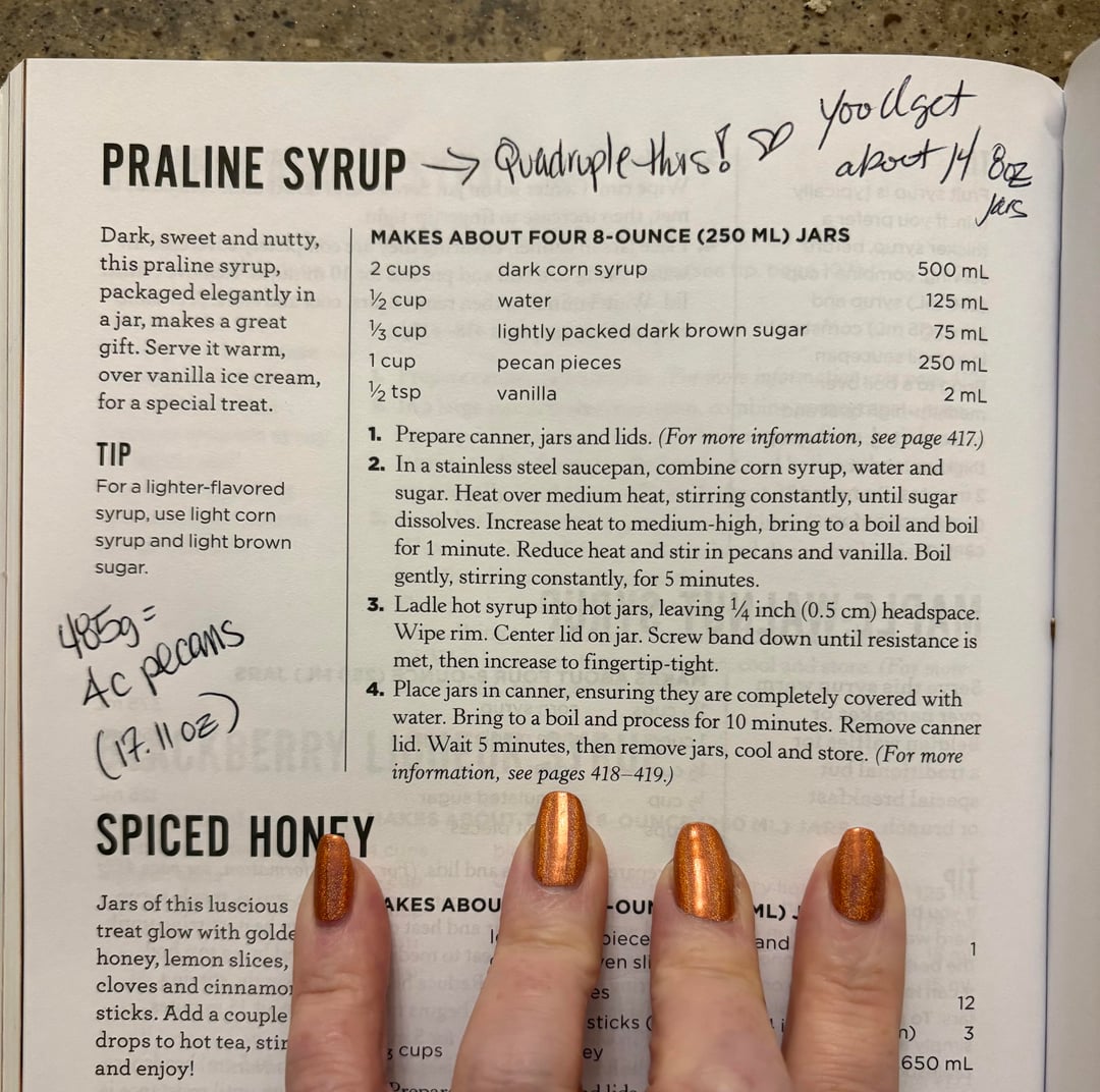I prefer to make it in 4x mode, as that’s about a pound of pecans and a half gallon of syrup. If it actually made 16 jars, it would also be two layers of WM ha’pints in my presto. If you’ve never worked with corn syrup though, it will EXPAND when boiling! Please be careful! You want to use the biggest pot you can – sugar boils at WAY hotter than water and sticks to EVERYTHING.