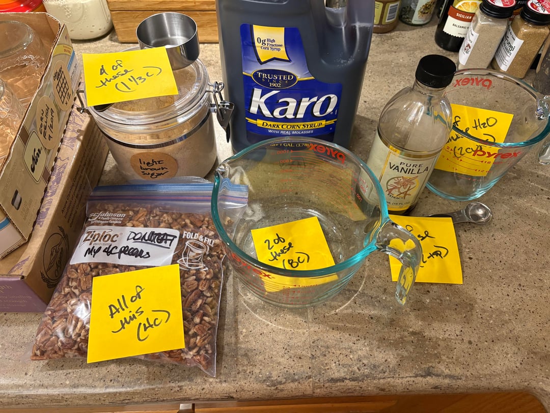 Photo Six: A tan countertop has the full ingredients for the 4x batch scattered about with notes and measuring tools. Clockwise from top left: A container of brown sugar with a metal 1/3 c measuring cup, a gallon jug of dark brown corn syrup, a bottle of vanilla, a measuring cup for water, a tsp for the vanilla, an XL glass measuring cup for the corn syrup, and a baggie filled with the pecan bits. This is how I am able to “can on lunch break” – I often set out all my “meeze” the night before with notes of what I need and measuring tools. More on this in the notes. Sharp eyes will notice the 8oz jars in the far left of the photo, washed and waiting to go into the canner to warm up.