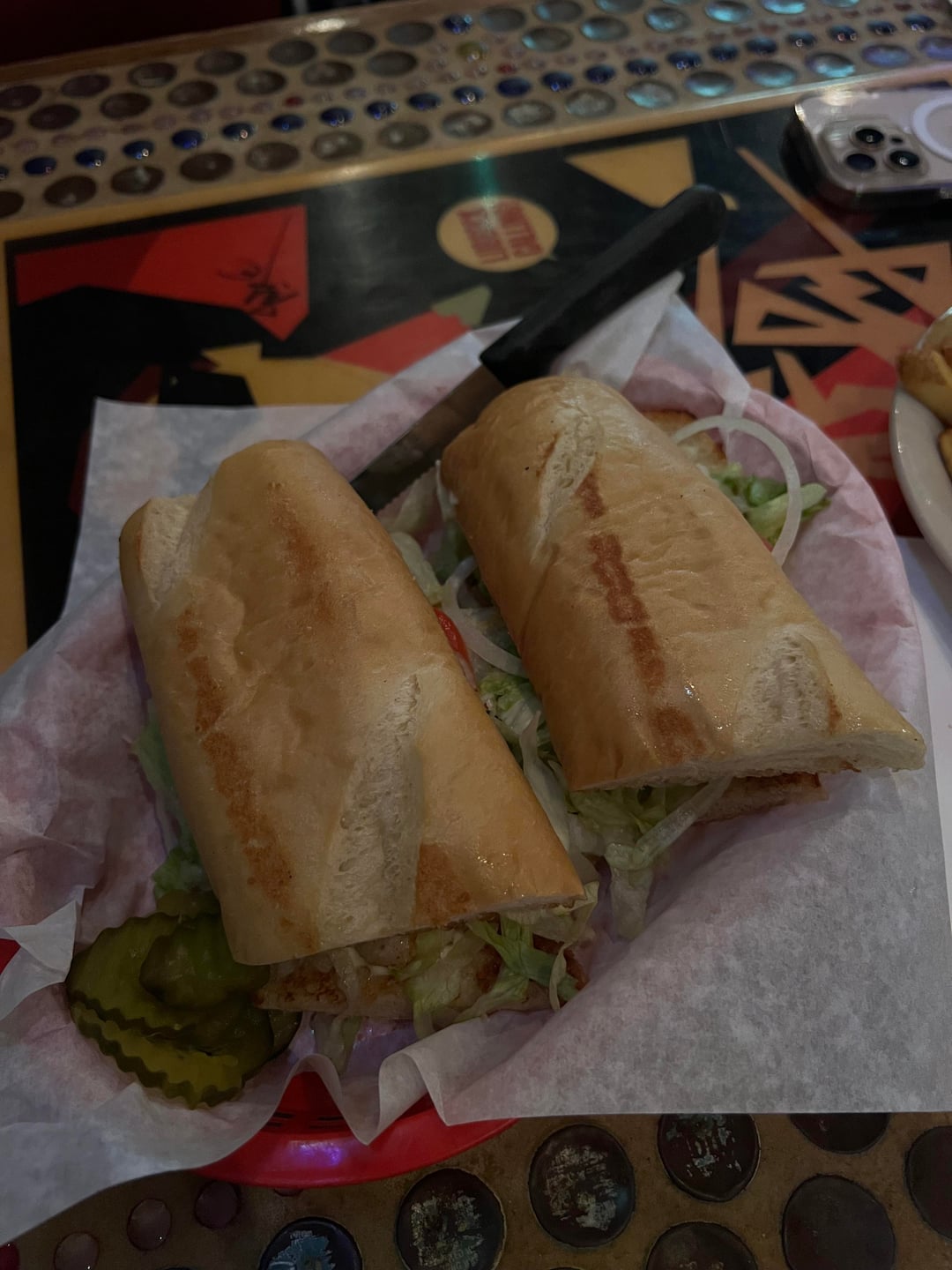 Grilled Shrimp Poboy (large $15.99) – french bread is perfect, packed with shrimp.