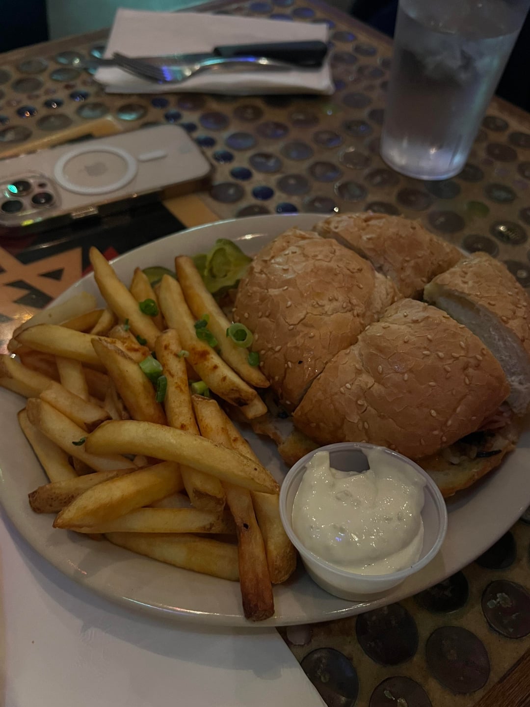 Muffuletta ($11.99) – one of my favorite sandwiches in Austin. Olive spread on both sides and some Jalepeno mayo on side to dunk in. Comes with a side.