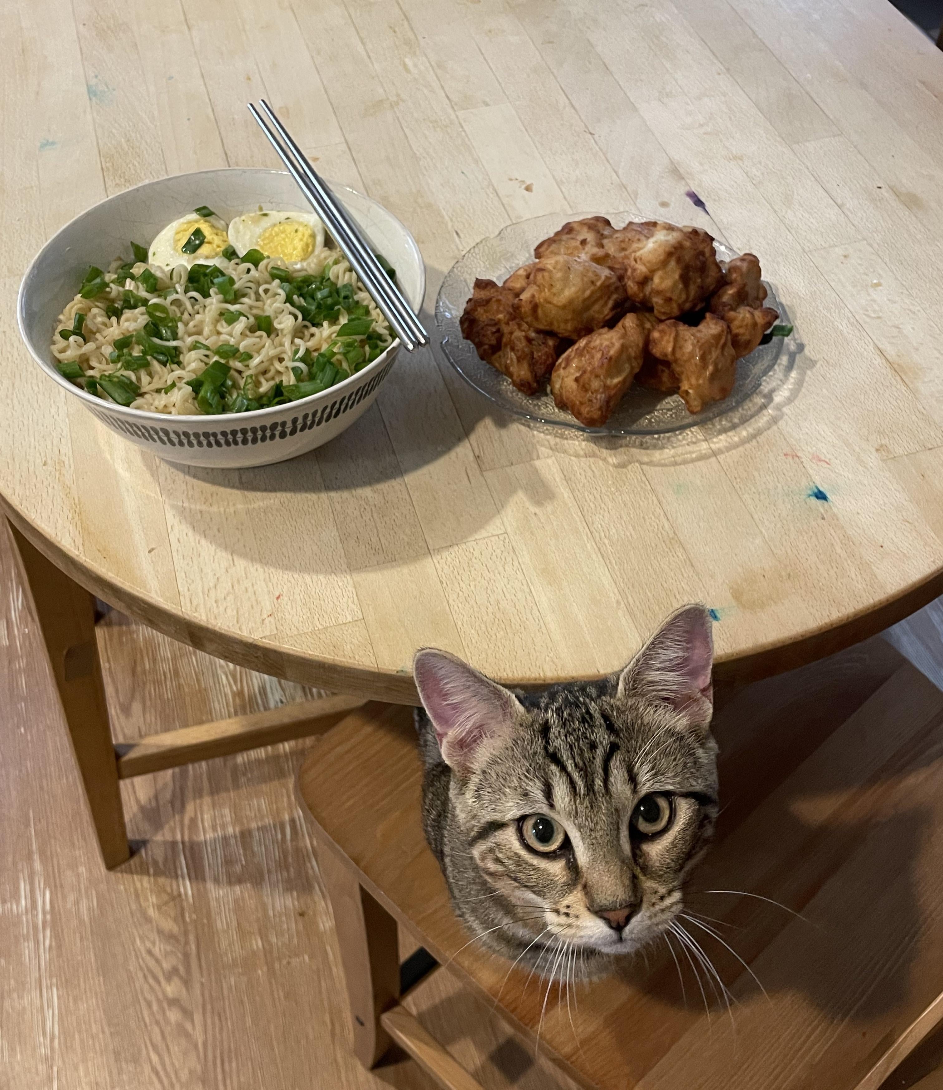RisingDarkPhoenix06 1 week ago That looks delicious (I’ve never had that type of ramen sadly). This may sound off topic, but your cat looks cute. What breed is your cat?