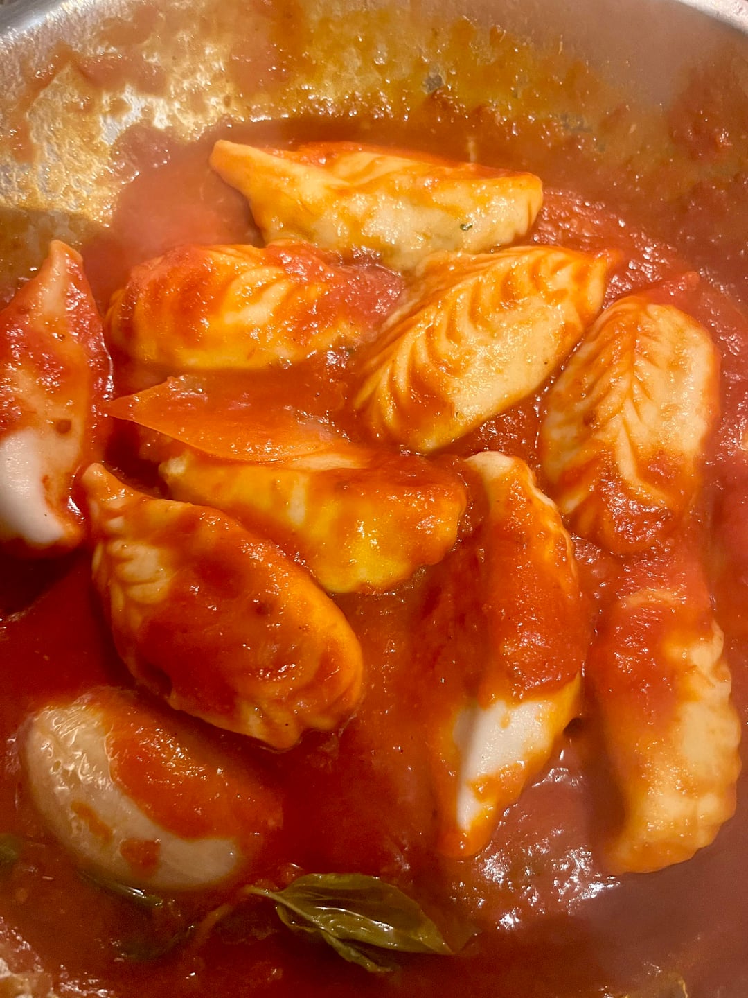 6) culurgiones (traditional dumplings from Sardinia filled with potato, pecorino, mint and garlic) with tomato sauce