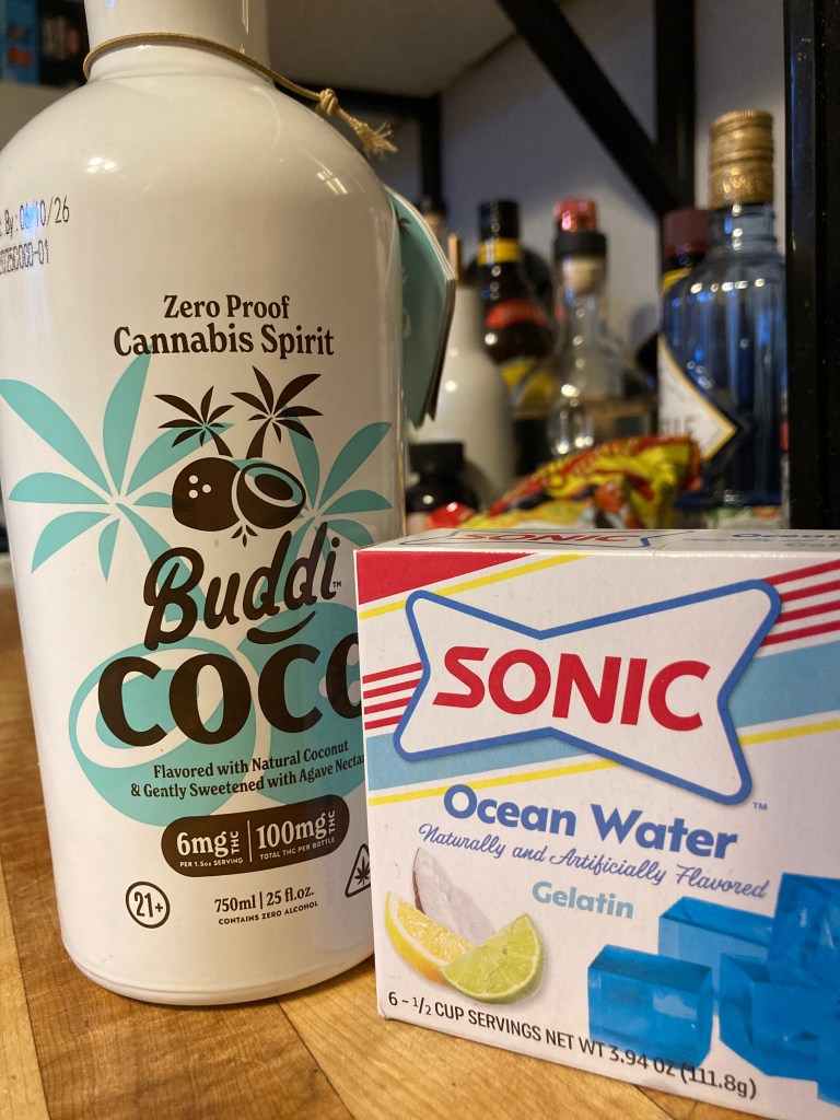 This jazzy Jell-O shot-style treat is inspired by Sonic’s Ocean Water, and actually uses Sonic Ocean Water flavor gelatin, which I found at H-E-B. I know – groundbreaking! It stars this great coconut-flavored cannabis spirit that swaps in wonderfully for Malibu. I just made a half batch by weighing the package using my handy scale and only using half. Another great use for a kitchen scale in case you never thought of it.